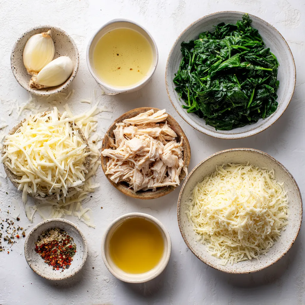First, gather your ingredients. You need cooked chicken, fresh spinach, cream cheese, mozzarella, and Parmesan. Also, grab chicken broth, garlic powder, onion powder, salt, pepper, olive oil, and red pepper flakes if you want some heat. This dish takes about 15 minutes to prep and 45 minutes in total.