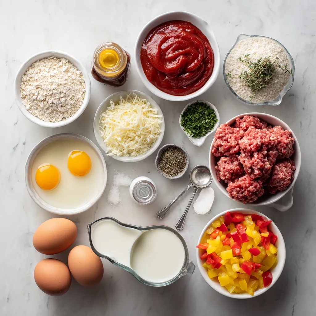 Herbs like oregano and thyme add freshness. Salt and pepper are must-haves for seasoning. Parmesan cheese and bell peppers add richness and color. Finally, parsley makes a nice touch when serving. Each ingredient plays a role in making your meatloaf both moist and full of flavor.