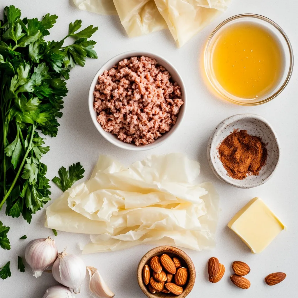 First, gather all your ingredients. This recipe is simple and fun. You will need ground chicken, onion, garlic, spices, and phyllo dough. Make sure your workspace is clean and organized.