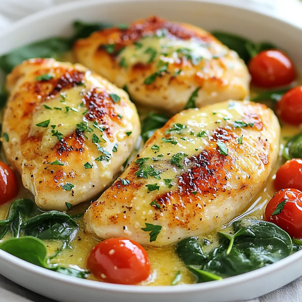 For presentation, plate the chicken with the sauce drizzled on top. Arrange spinach and tomatoes around the chicken for color. A sprinkle of fresh parsley adds a nice touch. A beautiful presentation makes your meal feel like a feast.