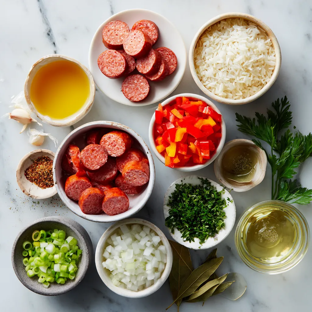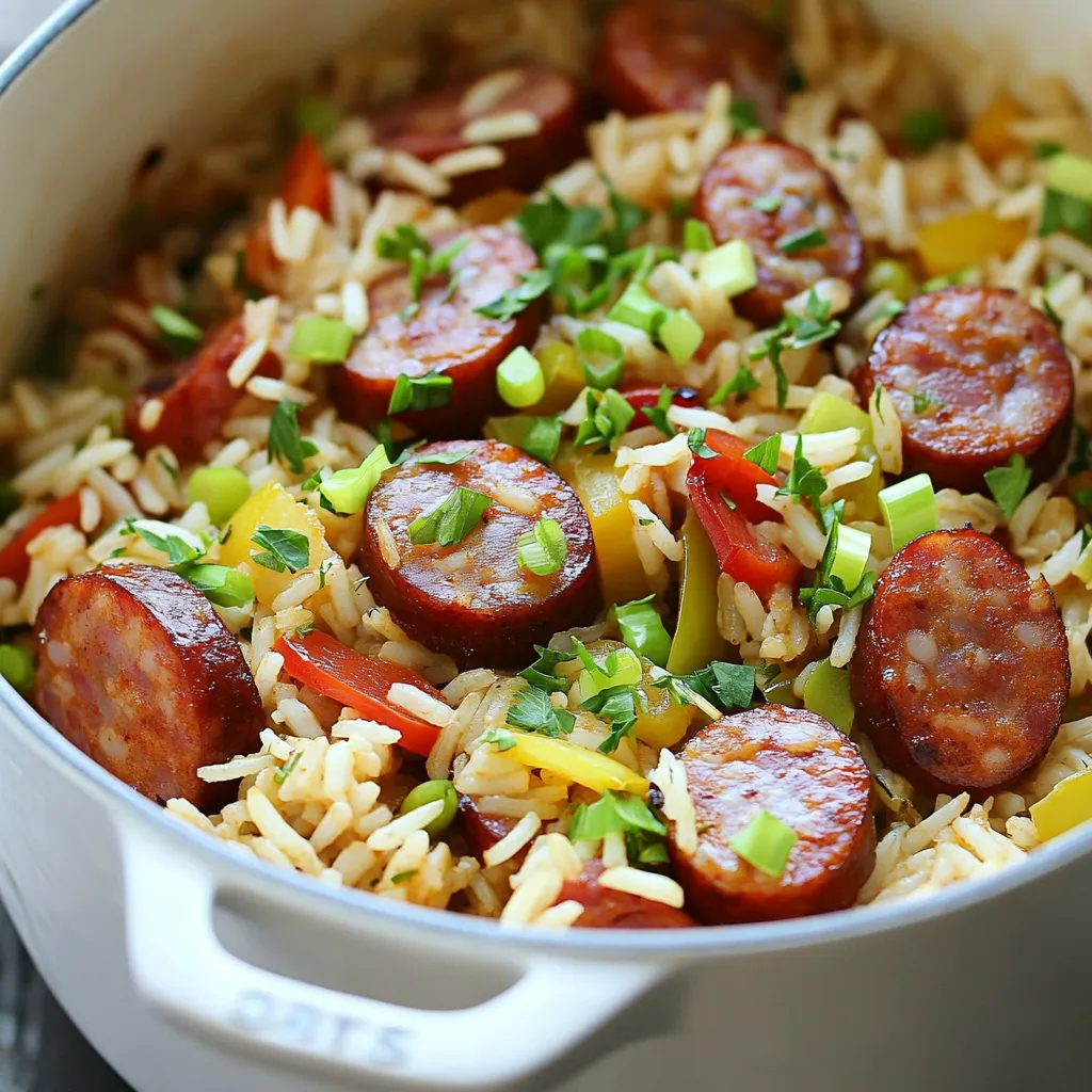 A flavorful one-pot dish featuring smoked sausage, rice, and vegetables with a Cajun twist.