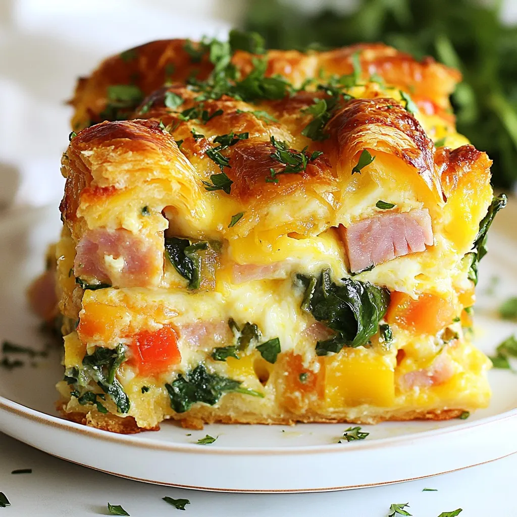 To create a tasty Overnight Croissant Breakfast Casserole, gather these key ingredients: - 6 large croissants, torn into pieces - 6 large eggs - 2 cups whole milk - 1 cup shredded Gruyère cheese - 1 cup diced cooked ham or turkey - 1 bell pepper, diced (any color) - 1 cup fresh spinach, chopped - 1 teaspoon garlic powder - ½ teaspoon salt - ½ teaspoon pepper - 1 tablespoon Dijon mustard - Fresh herbs for garnish (like parsley or chives) These ingredients work together to form a rich and fluffy dish. The croissants give a soft base, while the eggs and milk create a creamy texture. The cheese adds flavor and gooeyness. You can switch up the ham or turkey with your favorite protein. Fresh veggies like bell peppers and spinach add color and nutrients. Feel free to play with seasonings to suit your taste. This casserole is not just filling; it is a delightful breakfast that will impress anyone. Enjoy your cooking! {{ingredient_image_1}} 1. Preparing the Baking Dish: Start by greasing a 9x13 inch baking dish. You can use cooking spray or butter to coat it well. This step helps prevent sticking. 2. Layering the Croissants: Next, take your six large croissants and tear them into bite-sized pieces. Spread these pieces evenly in the greased dish. This will be the base for your delicious casserole. 3. Adding Fillings: Now, sprinkle the diced cooked ham or turkey over the croissants. Follow that with the diced bell pepper and chopped spinach. Finally, add ¾ cup of shredded Gruyère cheese. This mix adds great flavor and texture. 4. Making the Egg Mixture: In a large bowl, crack six large eggs. Whisk them together with two cups of whole milk, one teaspoon of garlic powder, ½ teaspoon of salt, and ½ teaspoon of pepper. Don't forget to add one tablespoon of Dijon mustard. This mixture binds everything together and adds richness. 5. Combining Ingredients: Pour the egg mixture evenly over the layered croissants and fillings. Make sure every piece is soaked. This step is key for a moist casserole. 6. Topping with Cheese: Sprinkle the remaining ¼ cup of Gruyère cheese on top. This will create a lovely cheesy crust when baked. 7. Covering and Refrigerating: Cover the baking dish tightly with plastic wrap. Place it in the fridge overnight or for at least four hours. This allows the flavors to meld beautifully. 8. Baking Instructions: Preheat your oven to 350°F (175°C). Take the casserole out of the fridge and let it sit at room temperature for about 15 minutes. Bake it uncovered for 45-50 minutes. You want it set and golden brown on top. 9. Cooling and Serving Tips: Once baked, let the casserole cool for a few minutes before slicing. This helps it hold its shape. Garnish with fresh herbs like parsley or chives for a pop of color and flavor. Enjoy your delightful breakfast treat! - Ensuring Even Soaking of Croissants To make sure all croissant pieces soak well, pour the egg mixture slowly. Use a spatula to press down on the croissants. This helps them absorb the liquid evenly. - Tips for Perfectly Whipped Eggs For fluffy eggs, whisk them well until the yolks and whites mix fully. Use a large bowl and a whisk or an electric mixer. Aim for a light, airy texture, which will help the casserole rise nicely. - Choosing the Right Cheese Gruyère cheese works great for its meltiness and flavor. You can also try cheddar or mozzarella for a different taste. Choose a cheese that melts well to give your casserole a creamy texture. - Recommended Cooking Time Adjustments If your casserole is cold from the fridge, it may need extra cooking time. Check for a golden top and a firm center. If it’s still jiggly, bake for another 5-10 minutes. Always keep an eye on it to avoid burning. Pro Tips Use Day-Old Croissants: For the best texture, use croissants that are a day or two old. They will absorb the egg mixture better without becoming too soggy. Customize Your Fillings: Feel free to mix and match your favorite vegetables or proteins. Zucchini, mushrooms, or even bacon can add a delicious twist! Let it Sit: Allowing the casserole to rest for at least 15 minutes before baking helps the croissants absorb the egg mixture, resulting in a fluffier texture. Garnish for Flavor: Don't skip the fresh herbs! They add a pop of color and a burst of flavor that elevates the dish. {{image_2}} Alternative Proteins (Chicken, Bacon) You can swap out the ham or turkey for cooked chicken or crispy bacon. Both options add great flavor. Chicken offers a milder taste, while bacon brings a smoky crunch. Use about a cup of either, chopped into bite-sized pieces. Different Cheese Options Gruyère cheese is rich and creamy, but you can use other cheeses too. Cheddar adds a sharp flavor, while mozzarella gives a milder taste. Feta cheese can bring a tangy twist. Choose any cheese that will melt well and fit your taste. Vegetarian Version To make a vegetarian casserole, skip the meat entirely. You can pile on more veggies like mushrooms, zucchini, or broccoli. This adds color and nutrients without losing flavor. Make sure to use eggs and cheese to keep it hearty. Seasonal Vegetable Additions You can change the vegetables based on what’s in season. In spring, add asparagus or peas. In fall, try butternut squash or kale. Seasonal veggies not only taste better, but they also make the dish fresh and vibrant. Experiment to find your favorite mix! Refrigeration Tips After baking, let the casserole cool down. Cover it tightly with plastic wrap or foil. Store it in the fridge for up to 3 days. This keeps it fresh and tasty. Freezing Instructions You can freeze the casserole before baking. Wrap it well in plastic wrap and then in foil. It can stay in the freezer for up to 2 months. When ready to bake, thaw it in the fridge overnight. Reheating Guidelines To reheat, preheat your oven to 350°F (175°C). Remove the cover and bake for 25-30 minutes. Check if it is heated through. It should feel warm in the center. You can also reheat slices in the micro