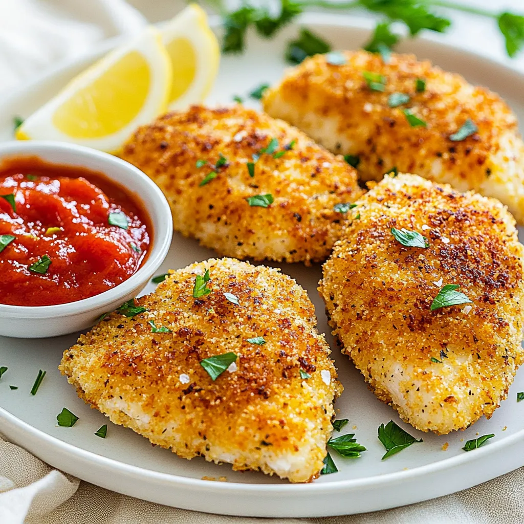 A deliciously crispy chicken dish coated with Parmesan and breadcrumbs, perfect for dinner.