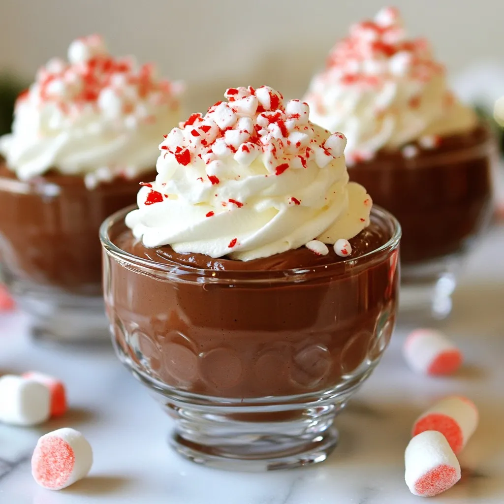 Once set, remove from the refrigerator and top each mousse with a dollop of whipped cream, sprinkle crushed peppermint candies on top, and add mini marshmallows if desired.