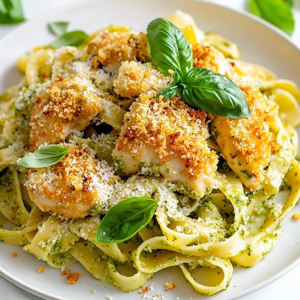 Pesto Pasta Delight with Crispy Parmesan Chicken