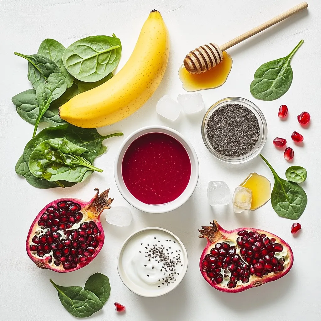Each ingredient plays a key role. Pomegranate juice adds a sweet and tart flavor. Greek yogurt makes the smoothie creamy and rich in protein. The ripe banana gives natural sweetness and a smooth texture. Fresh spinach adds nutrients without changing the taste much. Chia seeds provide fiber and omega-3s. Honey lets you adjust the sweetness to your liking. Ice cubes help make the drink cold and refreshing. Finally, pomegranate seeds on top add a nice crunch and color. This blend is not only tasty but also packed with health benefits.