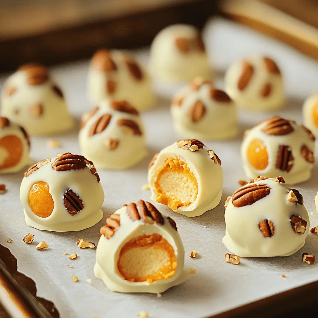 While the truffles chill, melt 1 cup of white chocolate chips in a microwave-safe bowl. If you want a smoother coating, add 1 tablespoon of coconut oil. Stir every 30 seconds until the chocolate is melted and smooth. Once melted, dip each chilled truffle into the white chocolate. Make sure they are fully coated. If you like, roll them in crushed pecans or walnuts for a tasty crunch. Place the coated truffles back on the parchment paper and let them set in the refrigerator for at least 30 minutes. This will harden the chocolate and make them ready to serve. Enjoy your homemade pumpkin cheesecake truffles!