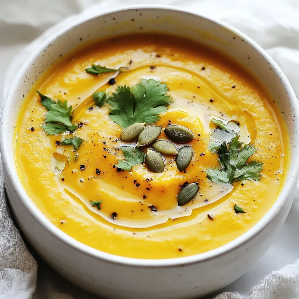 - 1 medium pumpkin (about 2-3 lbs), peeled, seeded, and cubed - 2 medium sweet potatoes, peeled and cubed - 1 onion, chopped - 2 cloves garlic, minced The main ingredients for this soup are simple yet flavorful. The pumpkin gives a nice base. Sweet potatoes add sweetness and creaminess. Onions and garlic enhance the taste. - 4 cups vegetable broth - 1 cup coconut milk The vegetable broth adds depth to the soup. Coconut milk adds creaminess and a slight sweetness. Together, they create a lovely balance. - 1 teaspoon ground ginger - 1 teaspoon ground cumin - 1/2 teaspoon cinnamon - Salt and pepper to taste - 2 tablespoons olive oil - Fresh cilantro or pumpkin seeds for garnish Seasonings bring the soup to life. Ground ginger adds warmth, while cumin gives it earthiness. A hint of cinnamon rounds out the flavors. Salt and pepper enhance all the tastes. Olive oil helps sauté the veggies and adds richness. For garnish, fresh cilantro or pumpkin seeds add color and crunch. {{ingredient_image_1}} To start, peel and cube the pumpkin. You want it in small pieces for even cooking. Next, peel and cube the sweet potatoes. They should match the pumpkin in size. Then, chop the onion finely. Finally, mince the garlic. This will give the soup a nice flavor. In a large saucepan, heat the olive oil over medium heat. Add the chopped onion and sauté until it turns soft, about five minutes. Stir often to prevent any burning. Once the onion is translucent, add the minced garlic. Cook this for about one minute until it smells great. Now, it's time to add the cubed pumpkin and sweet potatoes to the pot. Cook them for about five minutes. This will help them soften up a bit and blend well with the other flavors. Next, add the ground ginger, cumin, cinnamon, salt, and pepper to the pot. Stir well to coat all the veggies in these spices. Now, pour in the vegetable broth. Bring the mixture to a boil. Then, reduce the heat and let it simmer for 20 to 25 minutes. You want the pumpkin and sweet potatoes to be very tender. Once they are soft, use an immersion blender to blend the soup until it is smooth and creamy. If you don’t have one, you can use a regular blender in small batches. Return the blended soup to the pot and stir in the coconut milk. Heat it for another five minutes and taste. Adjust the seasoning if needed before serving. How to select a ripe pumpkin Choose a pumpkin that feels heavy for its size. Look for a smooth, firm skin. The color should be a rich orange. Avoid any with soft spots or blemishes. A good pumpkin will have a sturdy stem. Tips for peeling and cubing sweet potatoes Start by washing the sweet potatoes well. Use a vegetable peeler to remove the skin. Make sure to cut off any dark spots. Cut them into even cubes for uniform cooking. This helps them cook evenly and faster. Using fresh herbs vs. dried spices Fresh herbs add bright, bold flavors. Use cilantro or parsley for a fresh touch. Dried spices like ginger and cumin add warmth and depth. Both have their place in this soup. Experiment to find your favorite balance of flavors. Ideas for garnishing the soup Garnish your soup with fresh cilantro for color. You can also sprinkle pumpkin seeds for crunch. A swirl of coconut milk adds creaminess. Try adding a dash of chili oil for heat. These toppings make your soup look and taste amazing. Best pots for making soup A large, heavy-bottomed pot is ideal for soup. This helps distribute heat evenly. Look for options made of stainless steel or cast iron. These materials resist sticking and burning. Recommended blenders for silky texture An immersion blender works great for soups. It allows you to blend directly in the pot. If you prefer a stand blender, choose one with a powerful motor. This will give you a smooth and creamy texture in no time. Pro Tips Use Fresh Ingredients: Whenever possible, opt for fresh pumpkin and sweet potatoes to enhance the flavor and nutritional value of your soup. Adjust the Consistency: If you prefer a thicker soup, reduce the amount of vegetable broth, or add less coconut milk. For a thinner soup, simply add more broth until your desired consistency is reached. Spice It Up: Feel free to experiment with additional spices such as nutmeg or chili powder for a unique twist and added warmth to the soup. Storage Tips: This soup can be stored in the refrigerator for up to 5 days or frozen for up to 3 months. Just reheat it gently on the stove before serving. {{image_2}} You can easily modify this soup to fit your diet. For a gluten-free version, use certified gluten-free vegetable broth. Most vegetable broths are already gluten-free, but it's best to check. If you're looking for vegan options, this recipe is already a winner! Just ensure the vegetable broth you use is vegan. The coconut milk adds a rich and creamy texture without any animal products. Adding spices gives your soup extra warmth. Nutmeg is a great choice. Just add a pinch to the mix before blending. It adds a lovely depth to the flavor. You can also switch up the veggies! Try adding chopped carrots or parsnips along with the pumpkin and sweet potatoes. They add nice sweetness and diversity to the soup. This soup pairs well with bread or crackers. A slice of crusty bread can soak up all that creamy goodness. You can also serve it with crunchy crackers for a fun texture. You can make this soup a starter or serve it as a main dish. It’s hearty enough to stand alone. Don't forget to garnish with fresh cilantro or pumpkin seeds. They add bright color and a nice crunch! To store leftover soup, let it cool first. Then, pour it into an airtight container. Keep it in the fridge for easy access. You can also freeze the soup. Use freezer-safe bags or containers. Make sure to leave some space for expansion. Label the containers with the date. This way, you’ll know when you made it. To reheat the soup without losing flavor, use a saucepan. Heat it over medium-low heat. Stir it often to keep it from sticking. You can 