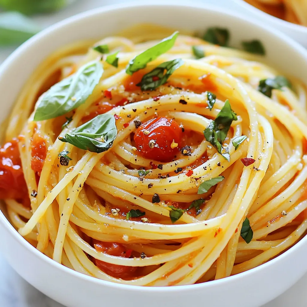 - 8 oz (225g) spaghetti or your favorite pasta - 1 tablespoon olive oil - 2 cloves garlic, minced - 1 can (14.5 oz) diced tomatoes (preferably fire-roasted) - 1 teaspoon sugar - Salt and pepper to taste - 1/4 cup fresh basil leaves, chopped - 1/4 teaspoon red pepper flakes (optional for heat) - Grated Parmesan cheese for serving (optional) To start, gather your ingredients. This list keeps things simple. You can use spaghetti or any pasta you like best. Olive oil and garlic add great flavor. Diced tomatoes bring the dish together. I love using fire-roasted tomatoes for extra taste. Sugar, salt, and pepper balance the flavors. Fresh basil adds a nice touch. If you want heat, red pepper flakes work well. Lastly, don't forget the Parmesan cheese if you enjoy it on top! {{ingredient_image_1}} To cook the pasta, start by boiling water in a large pot. Add a generous amount of salt to the water. This step enhances the flavor of the pasta. Once the water reaches a rolling boil, add your spaghetti or favorite pasta. Cook the pasta according to the package instructions until it is al dente. This usually takes about 8 to 10 minutes. While the pasta cooks, reserve 1/2 cup of the pasta water. This water will help adjust the sauce later. Once the pasta is ready, drain it in a colander, but keep that reserved water close. In the same pot, heat 1 tablespoon of olive oil over medium heat. Add 2 cloves of minced garlic. Sauté the garlic for about 1 minute. You want it fragrant, but not browned. Next, stir in a can of diced tomatoes with their juices. This is where the magic begins! Add 1 teaspoon of sugar, salt, and pepper to taste. If you like heat, toss in 1/4 teaspoon of red pepper flakes. Let the sauce simmer for about 5 to 7 minutes. This allows it to thicken slightly. Now it’s time to bring it all together. Add your drained pasta to the pot with the tomato sauce. Toss the pasta gently to coat it evenly. If the sauce looks too thick, pour in a splash of the reserved pasta water. This will help create a smoother sauce. Once the pasta is well mixed with the sauce, remove it from the heat. Fold in 1/4 cup of chopped fresh basil. This adds a burst of flavor. Taste and adjust the seasoning with more salt and pepper if needed. Now, your Quick Tomato Basil Pasta is ready to serve! To cook perfect pasta, aim for al dente. This means the pasta should be firm when bitten. Cooking it too long makes it mushy. Follow the package instructions for timing. Taste a piece a minute or so before the time is up. This way, you can catch it at just the right moment. Seasoning is key to a great dish. Always add salt to boiling water. This enhances the pasta's flavor. After draining, save some pasta water. It helps adjust the sauce later. If your sauce feels too thick, a splash of this water can make it just right. Fresh herbs are a game changer. They add bright flavors to your meal. Chop some fresh basil just before serving. This keeps it fragrant and green. You can also add more herbs like parsley or oregano for a twist. When serving, think about presentation. A simple sprig of basil on top looks beautiful. A light drizzle of olive oil adds shine. Use a nice bowl to serve the pasta. This makes the meal feel special. Remember, we eat with our eyes first! Pro Tips Use Fresh Ingredients: Whenever possible, use fresh tomatoes and basil for an enhanced flavor and aroma in your pasta dish. Adjust the Heat: If you prefer a milder dish, skip the red pepper flakes. For a spicier kick, feel free to add more to taste. Reserve Pasta Water: Always reserve some pasta cooking water; it helps to adjust the sauce consistency without thinning the flavor. Experiment with Cheese: Try different types of cheese like Pecorino Romano or a sprinkle of feta for a unique twist on your pasta. {{image_2}} You can change this dish by using different pasta types. Try penne, fusilli, or even gluten-free pasta. Each option brings a unique twist. Just remember to cook it al dente, as you would with spaghetti. Adding vegetables or protein can make this meal more filling. Consider tossing in sautéed spinach, zucchini, or bell peppers. These choices add color and nutrients. You can also include cooked chicken, shrimp, or chickpeas for protein. This way, you can enjoy a balanced meal. Experimenting with spices and herbs can elevate your dish. Besides fresh basil, try adding oregano, thyme, or parsley for added depth. A pinch of garlic powder or Italian seasoning can also boost the flavor. If you want to change the cheese, consider alternatives. Feta or goat cheese adds a tangy taste. You could also use mozzarella for a creamier texture. These variations allow you to customize your pasta to suit your taste. To keep your Quick Tomato Basil Pasta fresh, store it in an airtight container. This helps lock in flavor and moisture. Always let the pasta cool before sealing it. You can store it in the fridge for up to three days. If you want to keep it longer, consider freezing it. Frozen pasta can last for about three months, but the texture may change a bit. When it comes to reheating your pasta, the stovetop is the best method. Place the pasta in a skillet over low heat. Add a splash of water or olive oil to help it heat evenly. Stir gently to avoid sticking. If you use the microwave, add a little water and cover the dish to keep moisture in. This prevents the pasta from drying out. Always check the temperature before serving to ensure it's heated through. It takes about 10 minutes to prep and 20 minutes to cook. In total, you will spend around 30 minutes on this dish. This means you can enjoy a fresh meal in no time. The quick cook time makes it perfect for busy days. Yes, you can use fresh tomatoes! If you choose this option, use about 4-5 medium tomatoes. First, chop them and remove the seeds. This will help reduce excess moisture in the sauce. Fresh tomatoes will add a bright flavor to your pasta. Just remember to cook them a bit longer to soften up. You can 