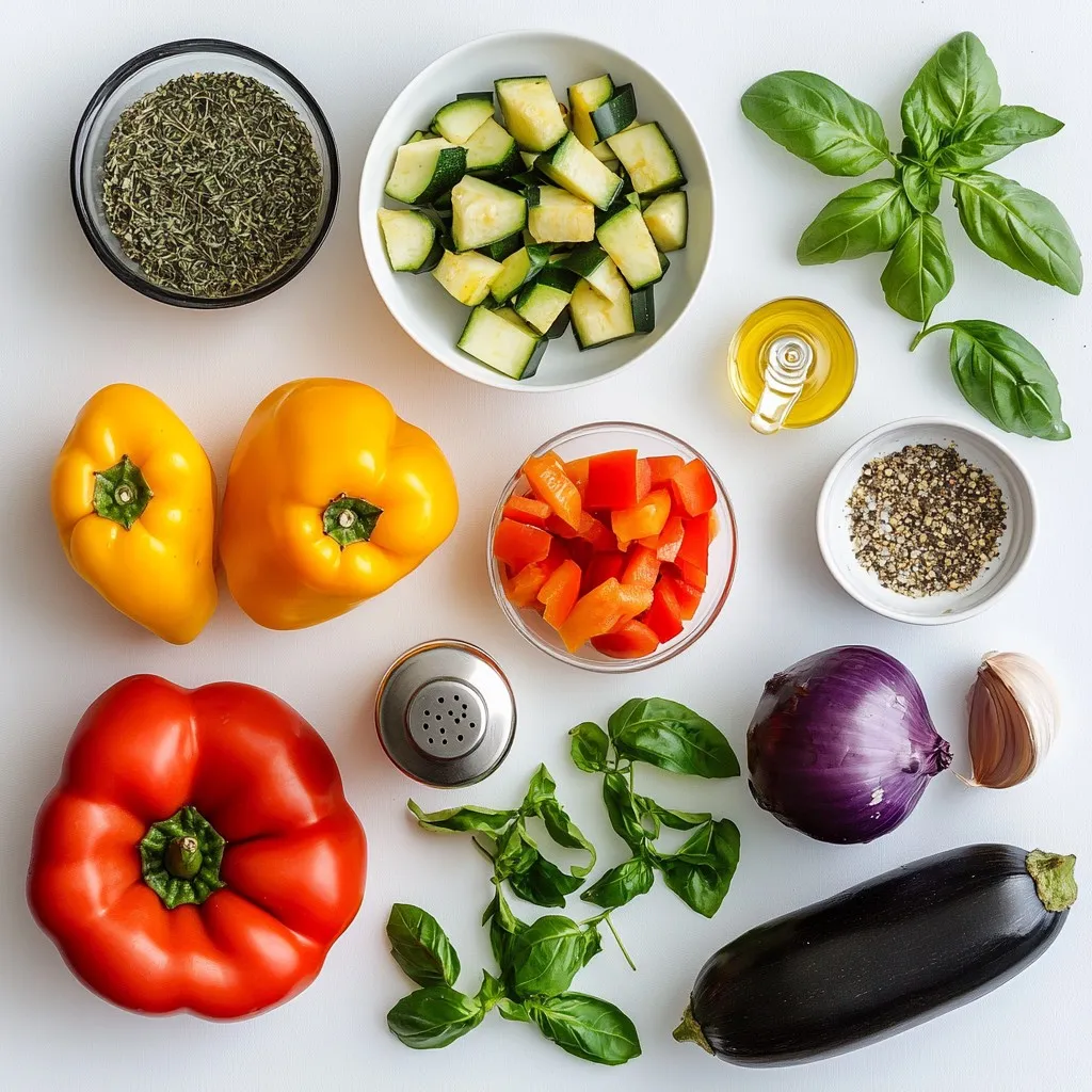 These veggies bring color and taste. The eggplant adds a soft texture. Zucchini gives a light crunch. The bell pepper and tomatoes add sweetness. Onions and garlic create a strong base for flavor.