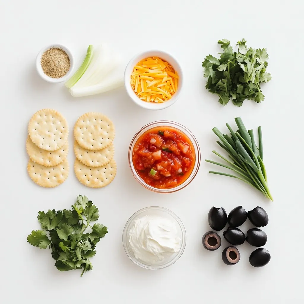 These ingredients create a perfect party snack. The Ritz crackers give a nice crunch. The cream cheese adds a creamy base. Salsa brings a burst of flavor. The cheese and olives add saltiness. Green onions give a fresh bite. Garlic and chili powder add depth.