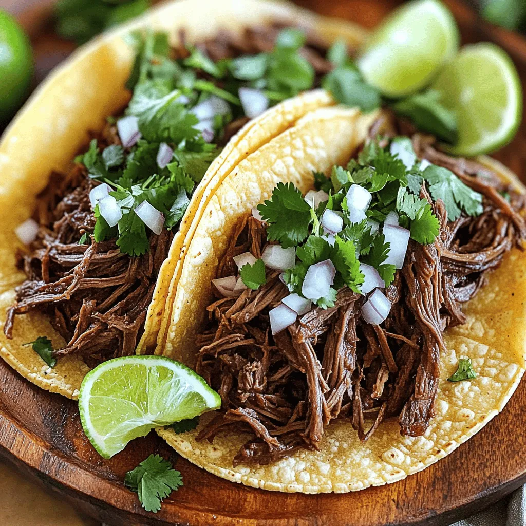 When serving your tacos, use warm corn tortillas. They add a nice texture and flavor. Spoon the shredded beef onto the tortilla and top with fresh cilantro and diced onion. A squeeze of lime juice adds brightness. For extra flair, serve with lime wedges and a sprinkle of salt. Enjoy your delicious tacos!