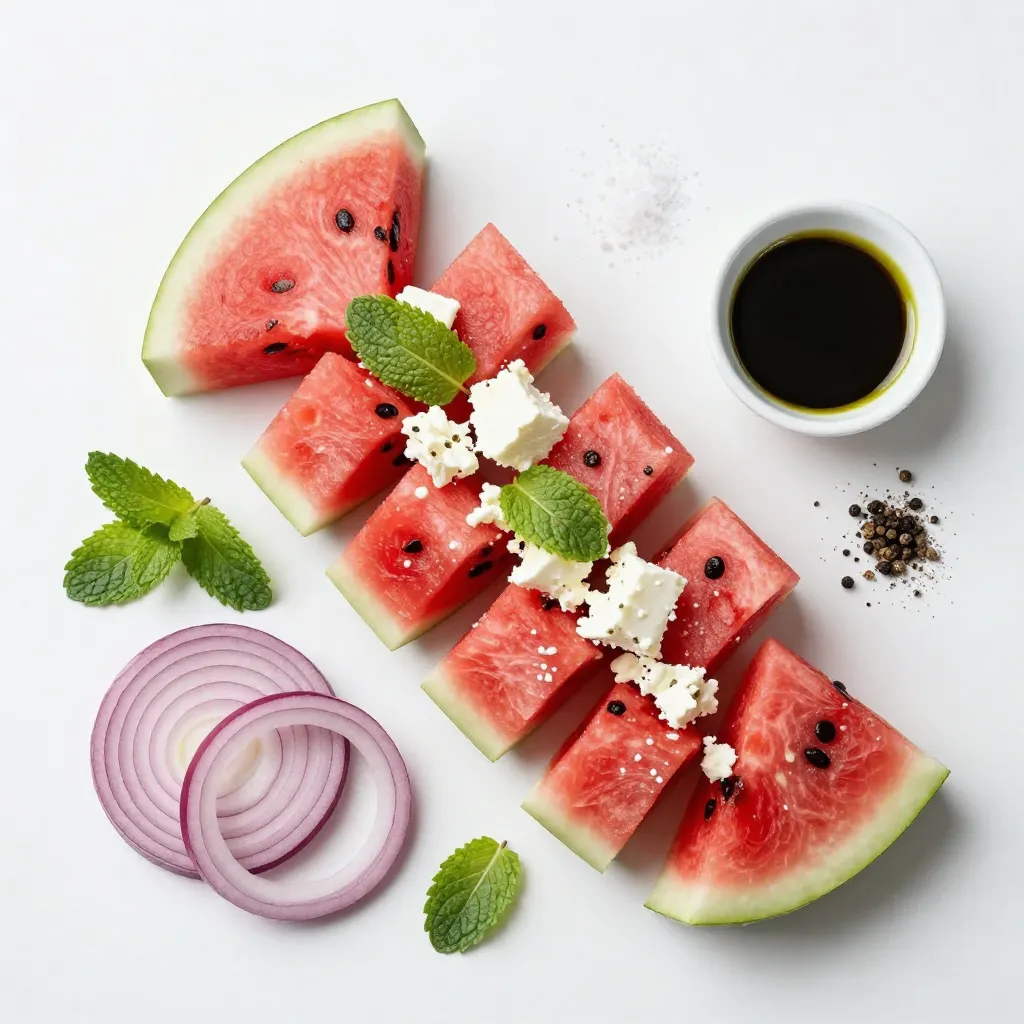 - Watermelon: 4 cups seedless, cubed - Feta Cheese: 1 cup, crumbled - Fresh Mint Leaves: 1/4 cup, chopped - Red Onion: 1/4, thinly sliced - Olive Oil: 2 tablespoons - Balsamic Vinegar: 1 tablespoon - Seasoning: Salt and freshly cracked black pepper - Servings: 6 - Prep Time: 15 mins - Total Time: 25 mins This Summer Watermelon Feta Salad is a perfect blend of sweet and savory. You need fresh watermelon for a juicy base, crumbled feta for creaminess, and mint leaves for a refreshing touch. The red onion adds a mild bite, balancing the flavors. For the pantry items, you will use olive oil and balsamic vinegar to make a simple dressing. A sprinkle of salt and freshly cracked black pepper will enhance all the flavors. This salad serves six and takes just 15 minutes to prepare. In total, you will spend about 25 minutes on this delightful dish. Perfect for summer gatherings or a light lunch, this salad is not just tasty but also healthy. {{ingredient_image_1}} - First, cut the watermelon into bite-sized cubes and place them in a large mixing bowl. This makes it easy to eat and enjoy. - Next, crumble the feta cheese evenly over the watermelon. The creamy feta adds a great taste that pairs well with the sweet watermelon. - Now, incorporate the chopped mint leaves into the bowl. Mint gives a fresh flavor that brightens the salad. - Also, add the thinly sliced red onion. The onion adds a nice crunch and sharpness to the mix. - In a small bowl, whisk together the olive oil, balsamic vinegar, salt, and pepper. This dressing brings all the flavors together. - Drizzle the dressing over the salad and toss gently. Be careful not to break the watermelon too much. This keeps the salad looking nice and fresh. To get the best taste from your salad, let it sit for 10 minutes after mixing. This time lets the flavors blend nicely. You can also adjust the seasoning. If you like more salt or pepper, feel free to add it. Taste as you go to find what suits you best. Make your salad look great by serving it in a large, shallow bowl. This style adds visual appeal and invites people to dig in. For a fun touch, garnish the top with whole mint leaves and a sprinkle of extra feta. This will brighten up your dish and make it pop! If you want to prepare your salad early, you can cut and mix the ingredients. Just remember to hold off on adding the dressing until right before serving. This keeps the salad fresh and tasty. Enjoy your meal prep while keeping the flavors at their best! Pro Tips Choose Ripe Watermelon: For the best flavor, select a watermelon that feels heavy for its size and has a uniform shape. Look for a creamy yellow spot on the underside, indicating ripeness. Fresh Feta Matters: Use high-quality feta cheese for a creamier texture and better flavor. Crumbled feta from a block tends to be fresher than pre-crumbled versions. Mint Preparation: Slap the mint leaves between your hands before adding them to the salad. This releases the essential oils, enhancing the minty aroma and flavor. Chill Before Serving: Allow the salad to chill in the refrigerator for about 30 minutes before serving. This not only enhances the flavors but also makes it more refreshing on a hot day. {{image_2}} You can mix in other fruits for fun flavors. Berries, like strawberries or blueberries, add a sweet touch. Chopped cucumbers add crunch and freshness. Adding citrus fruits, like oranges or grapefruits, gives a zesty kick. These fruits work well and make your salad even more colorful! Changing the cheese can change the taste. Goat cheese brings a creamy, tangy flavor. Blue cheese adds a strong, bold taste. Both options make the salad unique. Feel free to experiment and find your favorite cheese! You can swap the dressing for different tastes. Using lemon juice gives a bright, fresh flavor. Honey adds a touch of sweetness that balances the saltiness of the feta. If you want something creamy, try a yogurt-based dressing. These options let you customize the salad to your liking! To keep your salad fresh, refrigerate leftovers in an airtight container. It stays good for up to 2 days. Make sure to seal it tightly to avoid any odors from other foods. I do not recommend freezing this salad. The watermelon will lose its crisp texture. Once thawed, it may become mushy and unappealing. To keep your salad tasting its best, store the dressing separately. Mix it in just before you serve. This helps keep the watermelon and feta fresh and firm. Enjoy the flavors at their peak! Yes, you can use regular watermelon. However, it has seeds. This can change the texture. The seeds may add a crunch, but they can also be a hassle. Seedless watermelon cuts easily and has a sweeter taste. If you choose regular watermelon, be ready to remove the seeds. You have options if you don't have feta cheese. Here are some great substitutes: - Ricotta cheese offers a creamy texture. - Goat cheese adds tanginess and richness. - Vegan cheese can work for a dairy-free option. Each choice offers a different flavor, so pick one that you like best! This salad can work for meal prep, but with care. You can prepare the watermelon, feta, and herbs. Keep the dressing separate. This helps keep the salad fresh. Add the dressing just before eating to keep the flavors bright. Always store in an airtight container in the fridge. You can make a tasty watermelon and feta salad with simple steps. First, gather fresh watermelon, feta, mint, and red onion. Mix these with olive oil and balsamic vinegar for a refreshing dish. Serve it in a nice bowl and garnish it for a fun look. You can personalize it by adding other fruits or changing the cheese. Remember, keep the dressing separate until serving for the best taste. Enjoy this bright salad for meals or parties. It’s easy, quick, and very delicious!