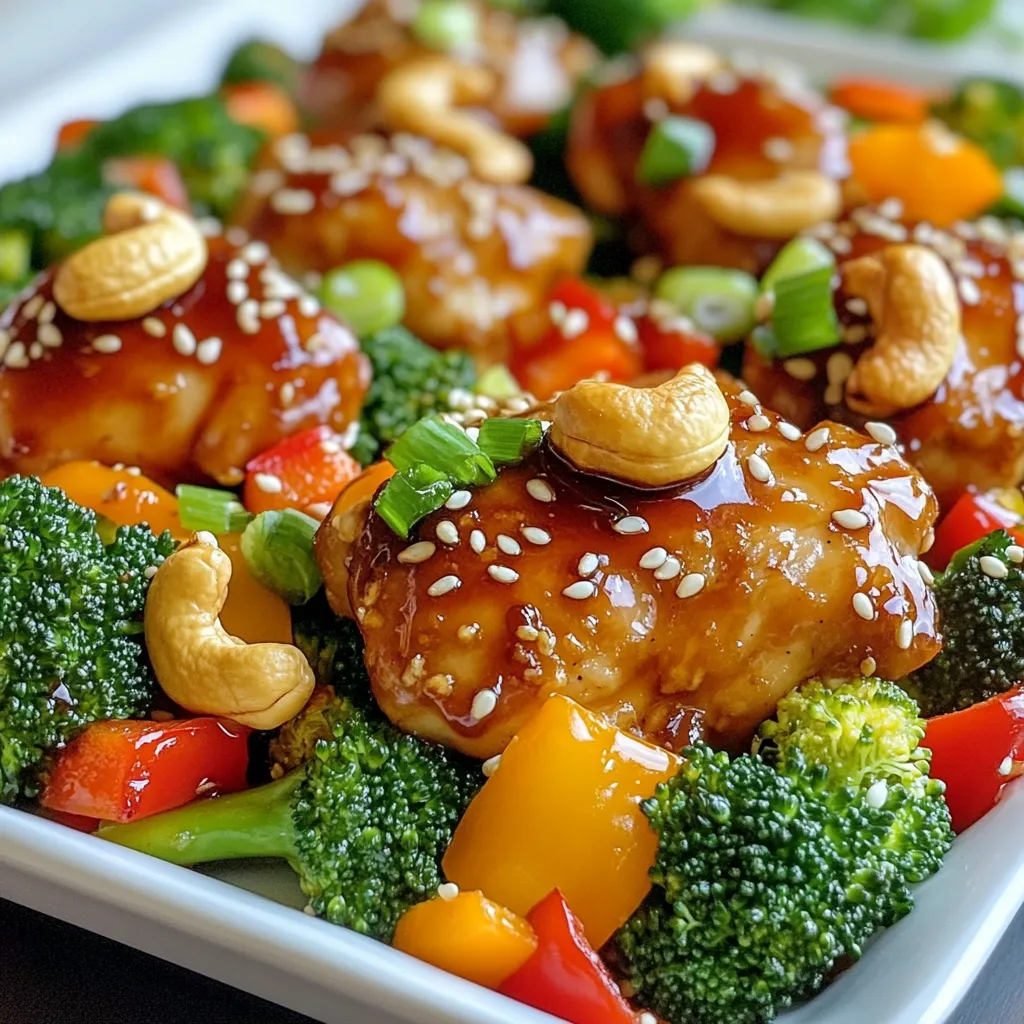 A delicious and easy one-pan meal featuring marinated chicken, colorful vegetables, and crunchy cashews.