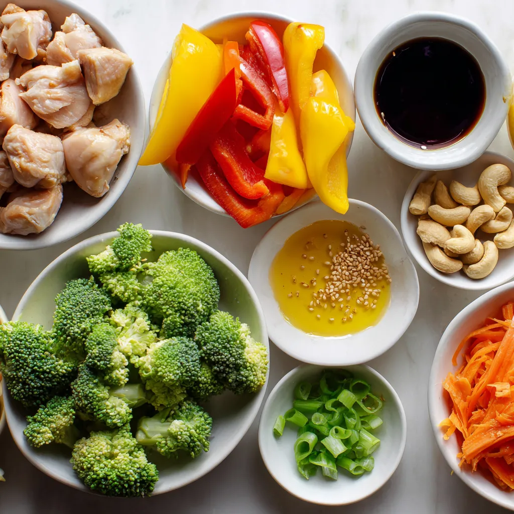 Each ingredient plays a part in creating a tasty meal. The chicken thighs add flavor and tenderness. The cashews give a nice crunch. Broccoli, bell pepper, and carrot add color and nutrition.