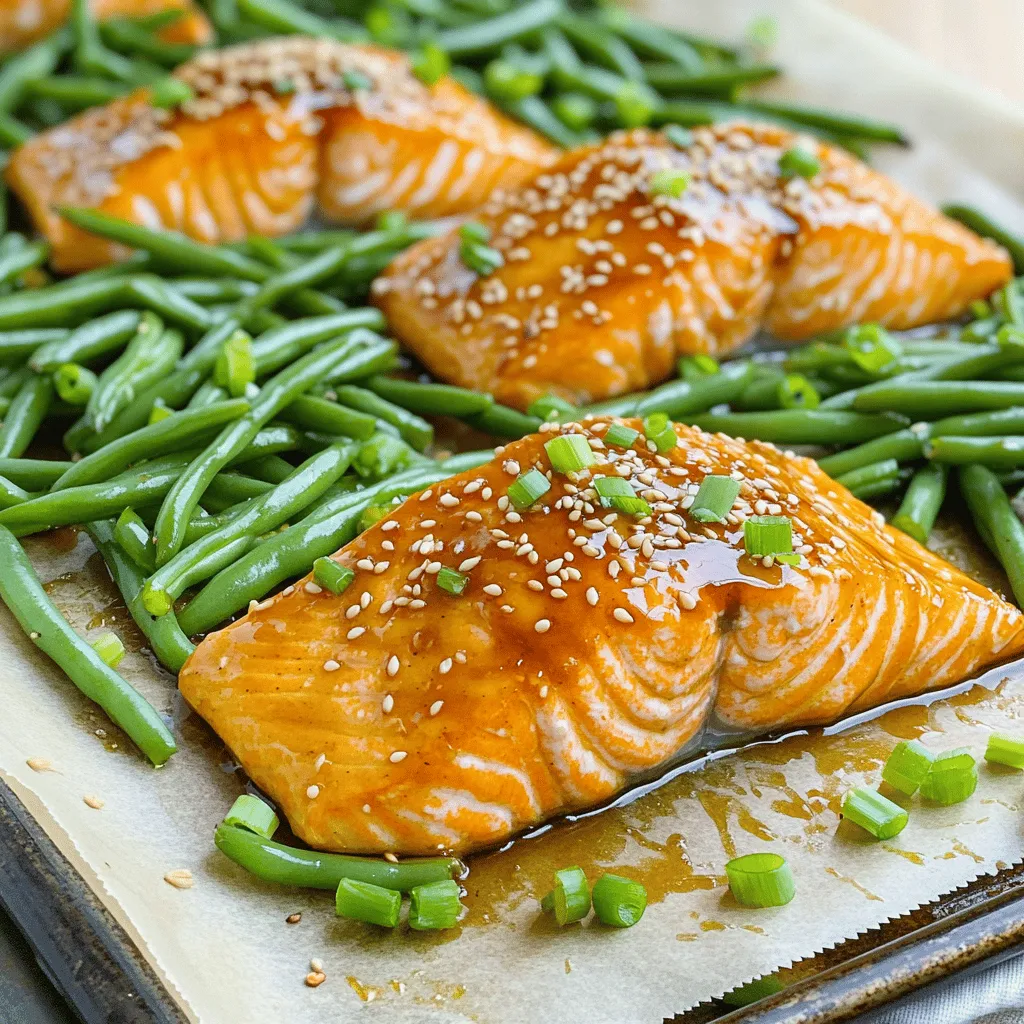 To make Sheet Pan Honey Garlic Salmon & Green Beans, you need simple and fresh ingredients. Here’s the full list: - 4 salmon fillets (about 6 oz each) - 1 lb fresh green beans, trimmed - 1/4 cup honey - 1/4 cup soy sauce (low sodium) - 3 cloves garlic, minced - 1 tablespoon sesame oil - 1 teaspoon grated fresh ginger - 1 tablespoon rice vinegar - 1 tablespoon olive oil - Salt and pepper to taste - Sesame seeds and chopped green onions for garnish Each ingredient plays a key role in the dish. The salmon provides protein and healthy fats. The green beans add crunch and color. Honey and soy sauce create a sweet and savory blend that coats the salmon. Garlic and ginger bring a warm, aromatic flavor. Using fresh ingredients makes a huge difference. Fresh green beans are crisp and vibrant. They hold their shape and taste during cooking. The salmon should be bright and firm for the best results. You can easily adjust the ingredients to your taste. If you like it sweeter, add more honey. For a bolder flavor, increase the garlic or ginger. Each choice allows for personal flair without losing the dish's essence. First, preheat your oven to 400°F (200°C). This heat will cook your salmon and green beans just right. While it warms up, line a sheet pan with parchment paper. This makes cleanup easier. Next, make the marinade. In a bowl, whisk together: - 1/4 cup honey - 1/4 cup low sodium soy sauce - 3 minced cloves of garlic - 1 tablespoon sesame oil - 1 teaspoon grated fresh ginger - 1 tablespoon rice vinegar Mix this well until it’s smooth and combined. Now, it's time to coat the salmon fillets. Place 4 salmon fillets in the center of the sheet pan. Pour half of the marinade over the salmon. Make sure each fillet is well coated. This adds great flavor. For the green beans, take 1 pound of trimmed fresh green beans. In a separate bowl, toss them with: - 1 tablespoon olive oil - Salt and pepper to taste Make sure they are evenly coated. This will help them roast nicely. Now, let's arrange everything on the sheet pan. Place the green beans around the salmon fillets. Drizzle the remaining marinade over the green beans for extra flavor. Bake in the preheated oven for about 15-20 minutes. Check doneness by seeing if the salmon flakes easily with a fork. The green beans should be tender-crisp. Once done, take the pan out and let it rest for a couple of minutes. This helps the flavors settle. Before serving, garnish with sesame seeds and chopped green onions for a pop of color and taste. Enjoy your meal! - How to tell when salmon is cooked You can check if salmon is cooked by looking for the color. Salmon should be opaque and easily flake with a fork. The internal temperature should reach 145°F (63°C). Use a food thermometer for accuracy. This ensures you serve safe and tasty fish. - Tips for reducing fishy smell To cut the fishy smell, soak the salmon in milk for 15 to 30 minutes before cooking. The proteins in milk help neutralize odors. Rinse the fillets after soaking and pat them dry. You can also use lemon juice in your marinade for a fresh taste. - Best practices for cooking green beans To get tender-crisp green beans, start with fresh ones. Trim the ends and rinse them well. Toss them with olive oil, salt, and pepper before baking. Bake them alongside the salmon for about 15-20 minutes. Keep an eye on them to ensure they stay bright and crisp. - Optional seasonings and garnishes You can boost the dish's flavor with some extra spices. Try adding red pepper flakes for heat or a sprinkle of garlic powder for more garlic flavor. Fresh herbs like cilantro or parsley can brighten the taste. For garnishing, sesame seeds and chopped green onions add a nice crunch and color. {{image_2}} If you want to switch things up, consider using other proteins. Chicken breasts or thighs work great. They soak up flavors well. You can also try shrimp. Just adjust the cooking time for shrimp to avoid overcooking. Tofu is a wonderful plant-based option. It absorbs the marinade beautifully and adds a tasty twist. You can use many vegetables for this dish. Broccoli is a nice choice. It adds crunch and color. Bell peppers can bring sweetness and flavor. Carrots are another great option. They add a hint of earthiness. Feel free to mix and match your favorites. Just keep the cooking time in mind for each veggie. Adjusting the marinade can make a big difference. For a sweeter taste, add more honey. If you like it spicier, try adding red pepper flakes. You can also use lime juice instead of rice vinegar for a zesty kick. Experiment with different herbs, like cilantro or basil, for fresh notes. These changes can personalize your dish and keep it exciting. To keep your salmon and green beans fresh, store them in the fridge. Use an airtight container. Place a piece of parchment paper between layers to prevent sticking. This keeps your dish tasty for up to three days. If you want to keep it longer, consider freezing. When reheating, I suggest using an oven or a skillet. Preheat your oven to 350°F (175°C). Place the salmon and green beans on a baking sheet. Cover with foil to keep moisture in. Bake for about 10 minutes. If using a skillet, heat over medium-low. Add a splash of water and cover until warm. This way, you keep the flavors intact. Yes, you can freeze this dish! First, let it cool completely. Use freezer-safe bags or containers. Remove as much air as possible to avoid freezer burn. Label with the date. You can freeze it for up to three months. When ready to eat, thaw in the fridge overnight and reheat as described above. Enjoy your delicious meal again! Salmon should reach an internal temperature of 145°F (63°C) to be safe. I use a food thermometer to check this. The fish should look opaque and flake easily with a fork. This ensures it is fully cooked and safe to eat. Yes, you can use frozen salmon. Thaw it in the fridge overnight for best results. If you need it quick, place it in a sealed bag and submerge it in 