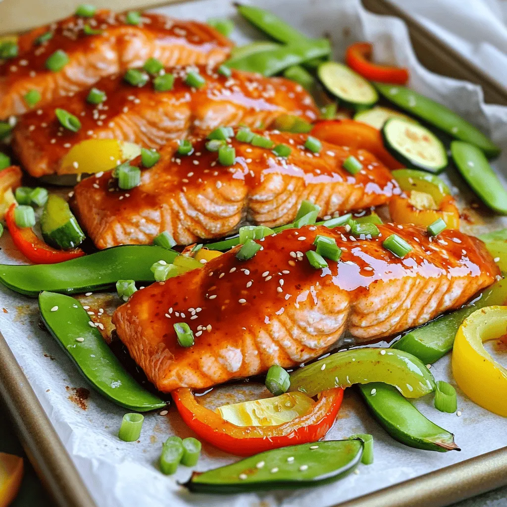 - 4 salmon fillets - 1/4 cup sweet chili sauce - 2 tablespoons soy sauce - 1 tablespoon freshly grated ginger - 2 cloves garlic, minced - 1 bell pepper (red or yellow), sliced - 1 zucchini, sliced - 1 cup snap peas - 2 tablespoons olive oil - Salt and pepper to taste - 2 green onions, sliced - Sesame seeds for garnish For this recipe, I love using fresh salmon fillets. They taste great and cook quickly. Sweet chili sauce gives the salmon a nice, sweet heat. The marinade adds flavor, thanks to soy sauce, ginger, and garlic. I always choose fresh vegetables for this dish. Bell peppers add color and crunch. Zucchini gives a soft texture, and snap peas bring sweetness. Toss these veggies in olive oil, salt, and pepper to make them shine. Finally, don’t skip the garnishes! Green onions and sesame seeds add a lovely touch. They not only look pretty but also add a burst of flavor. Now you’re ready to create a tasty meal! - Preheat the oven to 400°F (200°C). - Line a large baking sheet with parchment paper. First, you need to heat your oven. This step is key for cooking the salmon evenly. While the oven warms, get your baking sheet ready. Parchment paper keeps the salmon from sticking and makes cleanup easy. - Whisk together sweet chili sauce, soy sauce, ginger, and garlic. Next, make your marinade. In a small bowl, combine sweet chili sauce, soy sauce, grated ginger, and minced garlic. Use a whisk to mix them well. This marinade adds a sweet and spicy kick to the salmon. - Place salmon fillets and brush with marinade. - Toss vegetables with olive oil, salt, and pepper, then spread on the baking sheet. Now, it’s time to arrange your salmon and veggies. Place the salmon fillets on one side of the baking sheet. Brush them generously with the marinade you just made. Don’t forget to save some marinade for later! In another bowl, toss your sliced bell pepper, zucchini, and snap peas with olive oil, salt, and pepper. This step gives the veggies great flavor. Spread them on the baking sheet next to the salmon. - Bake for 15-20 minutes. - Drizzle reserved marinade in the last 2 minutes of baking. Put the baking sheet in the oven. Bake for 15 to 20 minutes. Keep an eye on the salmon; it should be flaky when done. In the last 2 minutes, drizzle the reserved marinade on top. This adds an extra layer of flavor to both the salmon and the veggies. Enjoy the delicious smell filling your kitchen! To get perfectly cooked salmon, look for a few signs. The flesh should change from bright pink to a pale, opaque color. You can also check if it flakes easily with a fork. A meat thermometer is your best friend here. Insert it into the thickest part of the salmon. It should read 145°F (63°C) for safe eating. This method prevents overcooking. Overcooked salmon can become dry and lose its flavor. Want more heat in your marinade? Add chili flakes or a touch of sriracha for a kick. This will make your dish spicy and exciting. If you want a gluten-free option, swap soy sauce for tamari or coconut aminos. Both options work well and still give a great taste. Don't be afraid to play with the flavors until you find your favorite mix. Feel free to switch up the vegetables! You can use asparagus, broccoli, or carrots for variety. Aim for a mix of colors for a beautiful plate. To ensure your veggies are crisp-tender, toss them well with olive oil, salt, and pepper. Spread them evenly on the baking sheet. This way, they cook perfectly alongside the salmon. Enjoy the crunch and vibrant flavors! {{image_2}} You can easily swap salmon for chicken or tofu. Both options taste great with the sweet chili sauce. - For chicken, use boneless breasts or thighs. Make sure to cook them for 25-30 minutes. - For tofu, press it first to remove water. Bake it for about 20-25 minutes. Adjust your cooking time based on the protein you choose. This change keeps the meal fun and fresh. Feel free to play with flavors. Teriyaki or hoisin sauce can replace sweet chili sauce. Both add a unique taste. - If you want a kick, add chili flakes or sriracha. - Fresh herbs like cilantro or basil add brightness. Experiment with spices too. This changes the dish while keeping it easy to make. Using seasonal veggies makes the dish better. Fresh ingredients boost flavor and nutrition. - Try asparagus in spring, or butternut squash in fall. - Bell peppers and zucchini are good any time of year. Keep an eye on what's fresh at your store. Adjust the recipe to use what you find. This ensures your meal is always tasty and exciting. To store leftovers properly, let the salmon cool first. Place it in an airtight container. Add the veggies too. Make sure to leave some space at the top. This helps prevent sogginess. You can keep it in the fridge for up to three days. For recommended storage containers, use glass or BPA-free plastic. They seal tightly and keep food fresh. Label each container with the date. This way, you know how long it has been stored. The best methods for reheating salmon include the oven or microwave. For the oven, preheat it to 350°F (175°C). Place the salmon on a baking sheet. Cover it with foil to keep it moist. Heat for about 10 minutes. For the microwave, use a microwave-safe plate. Cover the salmon with a damp paper towel. Heat in short bursts of 30 seconds. Check often to avoid overcooking. This keeps the texture and flavor intact. When freezing leftovers, let them cool completely. Wrap each piece in plastic wrap. Then, place them in a freezer bag. Squeeze out as much air as you can. This helps prevent freezer burn. You can freeze them for up to three months. For best practices in thawing frozen salmon, move it to the fridge overnight. This is the safest way to thaw. If you are in a hurry, you can use cold water. Just keep the salmon in its sealed bag and change the water every 30 minutes. Yes, you can use frozen salmon. To thaw it, place the salmon in the fridge overnight. If you need it faster, seal it in a plastic bag and submerge it