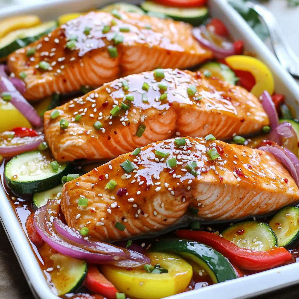 - 4 salmon fillets (about 6 oz each) - 1/2 cup sweet chili sauce - 2 tablespoons soy sauce - 2 tablespoons sesame oil - 1 teaspoon grated fresh ginger - 1 red bell pepper, sliced - 1 yellow bell pepper, sliced - 1 zucchini, sliced - 1 small red onion, cut into wedges - 2 green onions, chopped (for garnish) - Sesame seeds (for garnish) - Salt and pepper to taste You will need fresh salmon fillets for this dish. Salmon gives a rich taste and is healthy. Sweet chili sauce adds a sweet and spicy kick. Use soy sauce for depth and umami flavor. Sesame oil brings a nutty flavor that pairs well with salmon. Fresh ginger adds a warm zest that brightens the dish. Next, gather colorful vegetables. Bell peppers bring sweetness and crunch. Zucchini adds freshness and a nice texture. Red onion gives a slight bite that balances the flavors. For garnishes, green onions add brightness, and sesame seeds add a lovely crunch. Don't forget to season with salt and pepper. These simple ingredients come together to create a tasty meal. Each ingredient plays a vital role to make this sheet pan dish both simple and delicious. First, preheat your oven to 400°F (200°C). This step gets your oven ready for the salmon and veggies. I like to line my sheet pan with parchment paper. This way, cleanup is quick and easy. Next, grab a small bowl. In this bowl, whisk together 1/2 cup of sweet chili sauce, 2 tablespoons of soy sauce, 2 tablespoons of sesame oil, and 1 teaspoon of grated fresh ginger. Mix well until everything is combined. The marinade adds a sweet and spicy flavor to the salmon. Now, take your red and yellow bell peppers, zucchini, and red onion. Slice them into bite-sized pieces. Place these veggies on the lined sheet pan. Drizzle them with a little olive oil and season with salt and pepper. Toss them to coat in the oil and spices. This step helps the veggies cook evenly and taste great. It’s time to add the star of the dish! Place the 4 salmon fillets on top of the veggies, skin-side down. Pour the sweet chili marinade evenly over the salmon. Make sure each fillet gets a good amount of sauce. This adds flavor and keeps the fish moist. Slide the sheet pan into the preheated oven. Bake for 15-20 minutes. You’ll know it’s done when the salmon flakes easily with a fork and the veggies are tender. Keep an eye on it to avoid overcooking. When the dish is ready, carefully take it out of the oven. Sprinkle chopped green onions and sesame seeds over the salmon and veggies. This adds color and a nice crunch. Serve hot on individual plates, making sure each plate has some salmon and veggies. Enjoy your meal! To make a great marinade, use equal parts sweet chili sauce and soy sauce. This mix gives a nice balance of sweetness and saltiness. Add sesame oil for depth and fresh ginger for zing. Whisk all the ingredients well and let it sit for a few minutes. This allows the flavors to blend, creating a tasty glaze for your salmon. For a stronger flavor, marinate the salmon for 30 minutes before cooking. Choosing fresh salmon is key for this dish. Look for bright, moist fillets with no strong fishy smell. Wild-caught salmon has richer flavor and better texture than farmed salmon. If you prefer sustainable options, check for certifications on the packaging. Skin-on fillets help keep the fish moist while cooking, but skinless fillets work just as well. While the recipe calls for bell peppers, zucchini, and red onion, feel free to mix it up. Asparagus, broccoli, or snap peas work great, too. Just cut them into similar sizes for even cooking. Seasonal veggies add freshness and color to your dish. Remember to keep the cooking time in mind for different vegetables; some may take longer than others. To ensure even cooking, arrange the salmon and veggies in a single layer. Avoid overcrowding the pan, which can lead to steaming instead of roasting. If your oven has hot spots, rotate the pan halfway through cooking. This way, every piece gets that lovely roasted flavor. Check the salmon a few minutes before the time is up to avoid overcooking. It should flake easily with a fork when done. {{image_2}} If you like heat, add sliced fresh chilis to the marinade. I suggest using Thai bird chilis for a bold kick. You can also sprinkle chili flakes on top before baking. This adds flavor and heat. Adjust the amount based on your taste. You can make a sweet and spicy mix that excites your palate. For a fresh twist, use herbs like cilantro or basil. Chop them finely and mix with the marinade. This gives a bright flavor to the salmon. You can also try dill for a more traditional taste. Fresh herbs can brighten the dish and add aroma. Experiment with your favorite herbs for unique flavors. Feel free to swap in seasonal veggies. Asparagus and carrots work well in spring. In summer, try cherry tomatoes or corn. Fall brings squash and Brussels sprouts. Each season has its own bounty. Adding different vegetables keeps the dish fresh and fun. Choose what you love or what you find at the market. You can store any leftover salmon in an airtight container. Place it in the fridge. It will stay fresh for up to three days. Make sure to cool it down before sealing. Keep the veggies in the same container or separate. They also last for three days. Avoid leaving leftovers out for too long. To reheat the salmon, use an oven or a microwave. If you use an oven, preheat it to 350°F (175°C). Place the salmon on a baking sheet. Heat for about 10 minutes, or until warm. If using a microwave, cover the salmon with a damp paper towel. Heat in short bursts of 30 seconds. Check often to avoid overcooking. You can prepare the salmon and marinade ahead of time. Mix the sweet chili sauce, soy sauce, and other ingredients. Marinate the salmon for up to an hour in the fridge. Cut the veggies and store them separately. When ready to cook, just assemble everything on the sheet pan. This makes for a quick meal on busy days. Cook salmon on a sheet pan for 15-20 minutes