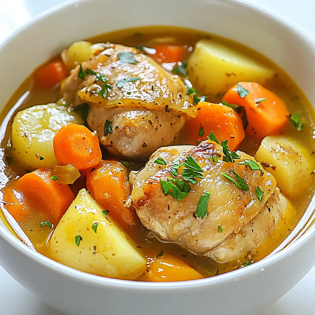 - 2 lbs boneless, skinless chicken thighs, cut into chunks - 4 medium carrots, sliced - 3 medium potatoes, diced - 1 onion, chopped - 3 cloves garlic, minced - 2 cups low-sodium chicken broth - 1 cup frozen peas - 1 cup green beans, trimmed and cut into 1-inch pieces - 2 teaspoons dried thyme - 1 teaspoon dried rosemary - Salt and pepper to taste - 1 tablespoon olive oil - 2 tablespoons cornstarch (optional, for thickening) - 2 tablespoons water (optional, for thickening) I like to use precise measurements to ensure great taste. For chicken, I use 2 lbs of thighs. This gives the stew a rich flavor. Carrots and potatoes add sweetness and heartiness. I use four carrots and three potatoes. The onion and garlic add depth. For the broth, I choose 2 cups of low-sodium chicken broth. It keeps the stew flavorful without being too salty. Frozen peas and green beans add color and nutrition. If you don’t have chicken thighs, you can use chicken breasts instead. They will work but may be less tender. For the broth, vegetable broth is a good option for a lighter taste. If you want to skip the potatoes, you can use sweet potatoes for a twist. You can also swap fresh vegetables for frozen ones if needed. Just make sure to adjust the cooking time. For the herbs, fresh thyme or rosemary can replace dried ones if you have them. {{ingredient_image_1}} First, gather all your ingredients. You need 2 pounds of chicken thighs. Cut them into chunks. Slice four medium carrots. Dice three medium potatoes. Chop one onion and mince three garlic cloves. Next, you can sear the chicken if you like. Heat one tablespoon of olive oil in a skillet. Add the chicken chunks and season with salt and pepper. Sear for about five minutes until golden brown. This step adds great flavor. Transfer the chicken to the slow cooker. In the same skillet, add the chopped onion, carrots, potatoes, and minced garlic. Sauté this mix for three to four minutes. You want the onion to be translucent. Then, transfer the vegetable mix to the slow cooker. Now, pour in two cups of low-sodium chicken broth. Add two teaspoons of dried thyme and one teaspoon of dried rosemary. Season with salt and pepper to taste. Gently stir everything together in the slow cooker. Cover the slow cooker. Cook on low for six to seven hours. If you are in a rush, you can cook on high for three to four hours. You want the chicken to be tender and fully cooked. About 30 minutes before serving, stir in one cup of frozen peas and one cup of green beans. These add color and nutrition. Cover and continue to cook until you are ready to serve. If you want a thicker stew, mix two tablespoons of cornstarch with two tablespoons of water to make a slurry. Stir this into the stew 15 minutes before serving. Let it cook on high until it thickens. Before you serve, taste your stew. Adjust the seasoning if needed. Serve it in deep bowls. You can garnish with fresh parsley or thyme for a pop of color. Enjoy this comforting meal with crusty bread by your side. To make your stew burst with flavor, use fresh herbs. Fresh thyme and rosemary add great taste. You can also add a splash of lemon juice. This brightens the dish. If you like heat, toss in some red pepper flakes. They add warmth without overpowering the stew. Sautéing the onions and garlic before adding them to the slow cooker can deepen the flavor. Browning the chicken adds a rich taste too. A common mistake is overcooking the chicken. This can make it dry. To avoid this, stick to the cooking times. If you cook on low, 6-7 hours is perfect. Don’t skip the salt and pepper; they are key for taste. Also, avoid adding too many vegetables. It can dilute the stew's flavor. Make sure to chop your veggies evenly for even cooking. You will need a few key tools for this recipe. A large skillet is great for browning the chicken and veggies. A good-quality slow cooker is a must. It ensures even cooking. Use a sharp knife for cutting the chicken and vegetables. A cutting board will keep your workspace clean. Finally, have measuring spoons and cups ready for accurate amounts. These tools make the cooking process smooth and fun. Pro Tips Choose the Right Chicken: Opt for boneless, skinless chicken thighs for a juicier and more flavorful stew compared to chicken breasts. Layer Flavors: Sear the chicken and sauté the vegetables before adding them to the slow cooker to enhance the overall flavor of the stew. Fresh Herbs: For a fresh taste, consider adding fresh thyme or rosemary towards the end of cooking instead of dried herbs. Storage Tips: Store leftover stew in an airtight container in the fridge for up to 3 days, or freeze for longer storage. {{image_2}} You can easily swap ingredients for different diets. For gluten-free options, use gluten-free broth. This simple change keeps your stew tasty and safe. If you want a low-carb version, replace potatoes with cauliflower. Cauliflower has a similar texture and absorbs flavor well. It makes your stew hearty without the carbs. You can adjust flavors to match your taste. Want heat? Add red pepper flakes or cayenne. This kick makes the stew more exciting. For a milder taste, skip the spices or use sweet paprika. You can also switch herbs. Instead of thyme, try oregano or basil. Each herb gives a new twist to your dish. Don’t hesitate to add more to your stew. Beans like white or kidney add protein and fiber. They make the dish even more filling. You can also include other veggies. Peppers, zucchini, or mushrooms work great. Just chop them up and toss them in the slow cooker. This way, your stew stays fresh and fun! After enjoying your chicken stew, store leftovers in an airtight container. Let the stew cool first. Once cool, place it in the fridge. Your stew will stay fresh for about 3 to 4 days. Be sure to label the container with the date. This way, you can keep track of how long it has been stored. You can freeze chicken stew if you want to save it for later. Use a freezer-safe container or