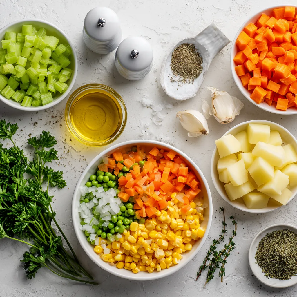 Start by washing all your vegetables. Dice the medium carrot, chop the celery, and finely chop the onion. Mince the garlic cloves. Peel and dice the potato. This makes sure all the flavors mix well in the soup.