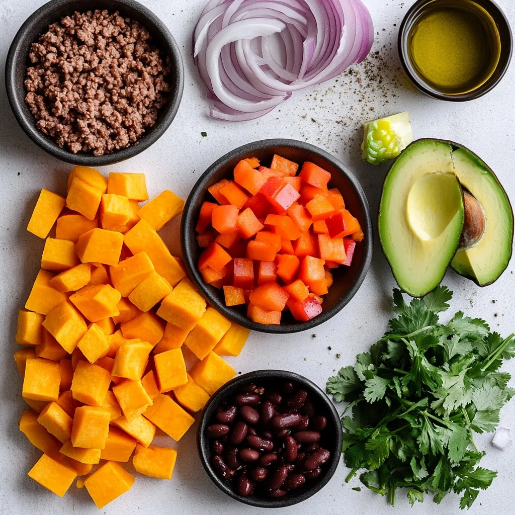 The main ingredients make this dish hearty and filling. Ground beef adds protein and flavor. You can use turkey for a lighter option. Sweet potatoes bring natural sweetness and good nutrition. The bell pepper and red onion add crunch and color.