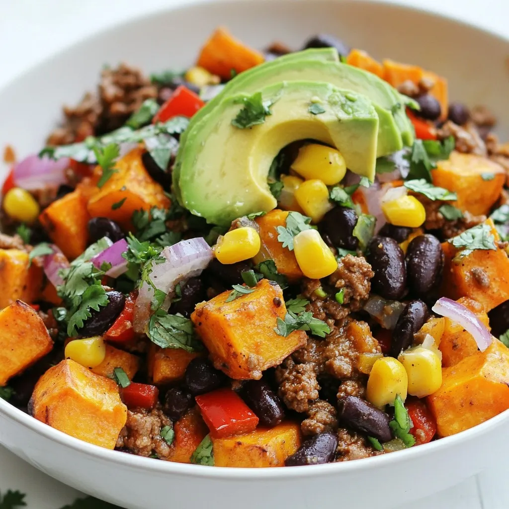 A hearty and flavorful skillet dish featuring ground beef, sweet potatoes, and southwestern spices.
