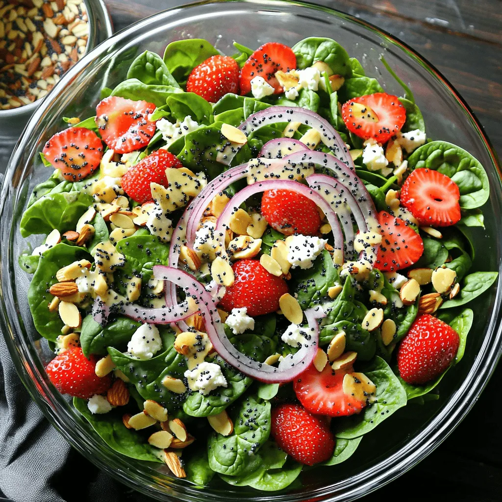 For this Strawberry Spinach Poppy Seed Salad, you need fresh ingredients for a bright taste. Here’s what you need: - 6 cups fresh spinach leaves, washed and dried - 2 cups fresh strawberries, hulled and sliced - 1/2 cup red onion, thinly sliced - 1/4 cup sliced almonds, toasted - 1/4 cup feta cheese, crumbled The spinach acts as a soft base. Strawberries bring sweetness and color. Red onions add a nice crunch and bite. The sliced almonds give a nutty flavor, while feta cheese adds creaminess. A good dressing makes every salad shine. For the dressing, you will need: - 1/2 cup olive oil - 1/4 cup apple cider vinegar - 2 tablespoons honey - 1/4 cup poppy seeds - Salt and pepper to taste This dressing is simple but full of flavor. Olive oil and apple cider vinegar create a great balance. Honey adds a sweet touch, and poppy seeds give it unique flavor and texture. Don’t forget to add salt and pepper to taste! You can make this salad your own with some optional toppings. Consider these add-ons: - Additional strawberry slices - Extra feta cheese - Chopped herbs like mint or basil - Avocado slices for creaminess Adding these toppings can change the salad’s taste. They also make it more colorful and fun. Experiment with your favorite flavors to create your perfect salad! To start, gather your dressing ingredients. You need olive oil, apple cider vinegar, honey, poppy seeds, salt, and pepper. Measure out each ingredient carefully. In a small bowl or jar, combine them all. Whisk or shake well until the mixture is smooth and blended. This step is key for a tasty salad. Now, let's move to the salad. Take a large mixing bowl and add the fresh spinach leaves. Make sure they are washed and dried. Next, add the sliced strawberries and thinly sliced red onion. These colors and flavors make the salad pop! Drizzle the prepared dressing over the salad. Toss gently to coat the leaves and fruits. This helps every bite taste great. Finally, sprinkle the toasted almonds and crumbled feta cheese on top. Give it one last gentle toss to mix everything nicely. You can serve the salad right away for the best taste. If you prefer a bit more flavor, refrigerate it for 10-15 minutes before serving. This allows the flavors to blend beautifully. For a stunning presentation, use a large glass bowl. It shows off the vibrant colors. Add extra strawberry slices and a sprinkle of poppy seeds on top for a lovely finish. Enjoy this fresh and bright salad! To make a great strawberry spinach poppy seed salad, start with fresh ingredients. Look for spinach that is bright green and crisp. Avoid any wilted or yellow leaves. Choose strawberries that are plump and firm. The best strawberries have a deep red color. Visit local farmers' markets for the freshest options. You may also find organic choices there. Red onions should be firm and have a nice color too. For the best taste, try to buy them the same day you plan to make the salad. When tossing your salad, keep it gentle. You want to mix the ingredients without crushing them. Start with the spinach and strawberries in a large bowl. Drizzle the dressing over the top. Use your hands or salad tongs to toss. Move from the bottom to the top, lifting the leaves. This method helps coat everything evenly. Add the red onion, almonds, and feta last. Just a quick toss will mix these toppings in nicely. This keeps everything fresh and crunchy! Presentation is key for any dish. Serve your salad in a large glass bowl. This way, the colors pop and look inviting. Top it with extra strawberry slices for a fresh touch. A sprinkle of poppy seeds adds a nice contrast. Consider adding a few whole almonds on top too. This gives it a rustic look. Serve the salad right away for the best taste. If you want the flavors to blend, chill it for 10-15 minutes before serving. Enjoy how beautiful and colorful your salad looks! {{image_2}} You can change the fruit in this salad to fit the season. For spring, try adding ripe peaches or juicy blueberries. In fall, use diced apples or pears. Each fruit brings new flavors and colors. This keeps the salad fresh and exciting all year. You can use whatever fruit you enjoy. Mix and match to find your favorite combo! If you want to switch up the nuts, try walnuts or pecans instead of almonds. Each nut has its own taste and crunch. Walnuts add a rich flavor, while pecans are sweet and buttery. You can also skip the nuts for a nut-free option. This way, you can cater to different diets and preferences. To make this salad vegan or dairy-free, skip the feta cheese. You can replace it with avocado for creaminess. Another option is to use sunflower seeds for added texture and nutrition. Make sure your dressing is dairy-free too. Use maple syrup instead of honey to keep it vegan. This way, everyone can enjoy your delicious salad! To store leftover salad, place it in an airtight container. You want to keep the spinach fresh. Cover the container tightly to block air. The salad will stay good for about 1 day. If you notice any sogginess, remove the wet items before storing. Always store it in the fridge. You can store the dressing in a separate jar. Keep it in the fridge for up to a week. Before using it again, shake it well. The oil and vinegar may separate, so mixing is key. If you want a fresh taste, consider making a new batch. To maintain freshness, keep the salad and dressing apart. Mix them only when ready to serve. This way, the spinach stays crisp and the strawberries stay bright. If you add toppings like almonds or feta, store them separately too. This keeps everything at its best for longer. Yes, you can make the dressing ahead. Mix the olive oil, apple cider vinegar, honey, poppy seeds, salt, and pepper in a jar. Shake it well and store it in the fridge. It will stay fresh for up to a week. This helps the flavors blend together nicely. Just give it a good shake before using it. If you want to replace feta cheese, try goat cheese or ricotta. Both add a creamy textur