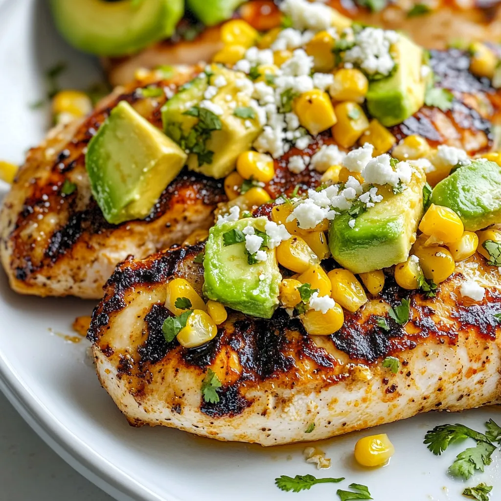 A delicious grilled chicken dish topped with a creamy corn mixture, perfect for a summer meal.