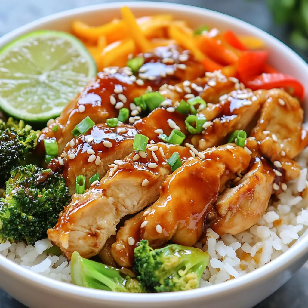 - 2 boneless, skinless chicken breasts - 1 cup jasmine rice - 1 cup water - 1 tablespoon olive oil - 1/4 cup low sodium soy sauce - 2 tablespoons honey - 1 tablespoon grated ginger - 2 cloves garlic, minced - 1 cup broccoli florets - 1 carrot, julienned - 1/2 red bell pepper, sliced - 1 teaspoon sesame seeds - 2 green onions, sliced - Salt and pepper to taste The main ingredients create the heart of this dish. The chicken provides lean protein. Jasmine rice offers a soft and fragrant base. Fresh veggies add color and nutrients. Each element plays a role in making this bowl delightful. - Additional seasonings, like chili flakes or black pepper - Suggested garnishes, such as lime wedges or cilantro Optional ingredients can enhance flavor. You can spice things up with chili flakes. A lime wedge adds a zesty twist. Fresh herbs like cilantro can elevate the bowl even more. - Caloric breakdown: About 450 calories per serving - Macronutrient content: Roughly 30g protein, 50g carbs, and 15g fat This dish is balanced and nutritious. It provides a good amount of protein and carbs. The healthy fats come from olive oil and sesame seeds. You can enjoy a tasty meal without guilt. {{ingredient_image_1}} - Rinsing and Preparing Rice: Rinse 1 cup of jasmine rice under cold water. Do this until the water runs clear. This helps remove excess starch. It keeps the rice from being too sticky. - Cooking Method: In a saucepan, mix the rinsed rice with 1 cup of water. Bring it to a boil, then reduce the heat. Cover the pot and cook for 15-18 minutes. The rice should become fluffy and tender. - Mixing Ingredients: In a small bowl, whisk together 1/4 cup of soy sauce, 2 tablespoons of honey, 1 tablespoon of grated ginger, and 2 minced garlic cloves. Make sure the honey dissolves well in the sauce. - Cooking Techniques: After mixing, set the sauce aside. We will pour it over the chicken later. The flavors will blend nicely when we heat it. - Chicken Cooking Instructions: Heat 1 tablespoon of olive oil in a large skillet over medium-high heat. Season 2 boneless, skinless chicken breasts with salt and pepper. Cook each side for 6-7 minutes until they are golden brown and fully cooked. - Stir-Frying Vegetables: Remove the chicken from the skillet and let it rest. In the same skillet, add 1 cup of broccoli florets, 1 julienned carrot, and 1/2 sliced red bell pepper. Stir-fry these for 4-5 minutes. They should be tender but still bright in color. - Layering Techniques: Start with a base of rice in a deep bowl. Slice the rested chicken into strips and lay it over the rice. Top the chicken with the stir-fried vegetables. - Presentation Tips: Drizzle any leftover teriyaki sauce on top. Finish by sprinkling 1 teaspoon of sesame seeds and 2 sliced green onions. For a fresh touch, add a slice of lime on the side. This makes each bowl look bright and inviting! Ensuring Tender Chicken To keep chicken tender, cook it on medium heat. This way, it cooks evenly. Use a meat thermometer to check. The chicken should reach 165°F inside. Let it rest for a few minutes before slicing. This helps keep all the juices in. Perfectly Cooked Rice Rinsing jasmine rice is key. Rinse until the water is clear. This removes extra starch. For cooking, use one cup of water for one cup of rice. Bring it to a boil, then lower the heat. Cover the pot and cook for 15-18 minutes. Fluff it with a fork after cooking. Adjusting Sweetness You can change the sauce’s sweetness to fit your taste. Add more honey for a sweeter sauce. If you like it less sweet, reduce the honey. Taste it as you mix. This way, you get it just right. Alternative Sauce Ingredients Want to try something new? Use maple syrup instead of honey. You can also mix in a splash of rice vinegar. This adds a nice tang. Experiment with different flavors to find what you love. Pairing Side Dishes Serve your Teriyaki Chicken Bowl with simple sides. Steamed edamame or a fresh salad works well. They add color and crunch to your meal. You can also try pickled vegetables for a nice contrast. Best Drinks to Accompany For drinks, green tea is a great choice. It’s light and refreshing. You can also serve sparkling water with lime. This adds a fun twist and helps cleanse the palate. Pro Tips Marinate for More Flavor: Allow the chicken to marinate in the teriyaki sauce for at least 30 minutes before cooking for deeper flavor penetration. Use Fresh Ingredients: Opt for fresh garlic and ginger instead of powdered for a more vibrant flavor in your sauce. Don't Overcook the Vegetables: Stir-fry the vegetables just until tender to retain their color and crunch, enhancing the dish's texture. Garnish Creatively: Consider adding sesame oil drizzle or chili flakes as a garnish for an extra layer of flavor and visual appeal. {{image_2}} You can easily make a teriyaki bowl without chicken. Tofu or tempeh works great as a substitute. - Tofu or Tempeh Substitutes: Use firm tofu or tempeh for a nice texture. Cut them into cubes. Marinate them in soy sauce and honey for extra flavor. Cook them until golden brown for the best taste. - Additional Vegetables to Include: Add mushrooms, snap peas, or bell peppers. These vegetables add crunch and color. You can also try bok choy or zucchini for more variety. If you need a gluten-free dish, it's easy to adapt. - Choosing a Gluten-Free Soy Sauce: Use tamari or coconut aminos. Both options are good replacements for regular soy sauce. They provide the same savory flavor without gluten. - Alternative Ingredients: You can use cauliflower rice instead of jasmine rice. It’s low in carbs and adds a fresh taste. Also, check that your honey is pure and gluten-free. Get creative with your teriyaki bowl by adding new flavors. - Spicy Teriyaki Options: For a kick, add sriracha or chili flakes to your sauce. This adds heat without losing the sweet teriyaki flavor. Adjust the amount to your spice preference. - Adding Citrus Flavors: Squeeze fresh lime or lemon juice over your bowl. It br