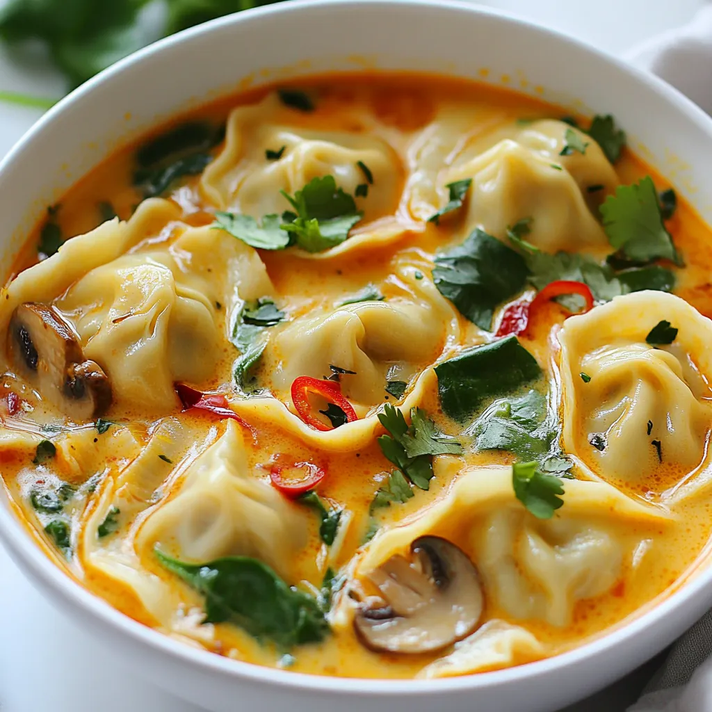 - 1 cup all-purpose flour: This is the base for our dumpling dough. It gives the dumplings structure and a soft bite. - 1/2 cup water: Water helps to bring the flour together into a dough. It ensures the dumplings are not too dry. - 1/2 teaspoon salt: Salt enhances the flavor of the dough. It also helps strengthen the gluten in the flour. - 1 tablespoon vegetable oil: This adds moisture to the dumpling filling and helps to sauté the vegetables. - 1 cup coconut milk: Coconut milk adds creaminess and a rich flavor to the soup. It balances the spice from the curry. - 1 tablespoon red curry paste: This is the heart of the soup. It brings warmth and a bold flavor that makes the dish special. - 2 cups vegetable broth: Broth forms the soup base. It adds depth and complements the coconut milk. - 1 medium onion, diced: Onions add sweetness and aroma. They are key in making the soup flavorful. - 2 cloves garlic, minced: Garlic provides a fragrant, savory note. It pairs well with the onion. - 1 tablespoon ginger, grated: Ginger adds heat and freshness. It brightens the overall flavor of the soup. - 1 cup mushrooms, sliced: Mushrooms contribute an earthy flavor and nice texture to the soup. - 1 cup baby spinach: Spinach adds color and nutrition. It wilts beautifully into the soup. - 1 tablespoon soy sauce: Soy sauce adds umami. It deepens the flavor of the soup. - 1 teaspoon lime juice: Lime juice brightens the dish. It adds a zesty kick that balances the richness. - Fresh cilantro leaves for garnish: Cilantro adds freshness and a pop of color. It makes the dish visually appealing. - Sliced red chili for heat (optional): If you like spice, red chili adds a nice kick. Adjust this to your taste. {{ingredient_image_1}} To make the dumpling dough, start by mixing 1 cup of all-purpose flour and 1/2 teaspoon of salt in a bowl. Slowly add 1/2 cup of water while stirring. You want the dough to form a ball. Once it comes together, knead it on a floured surface for about five minutes. The goal is a smooth texture. After kneading, cover the dough with a damp cloth. Let it rest for 20 minutes. This resting time helps the dough become more pliable and easier to shape later. In a large pot, heat 1 tablespoon of vegetable oil over medium heat. Add 1 medium onion, diced, along with 2 cloves of minced garlic and 1 tablespoon of grated ginger. Sauté these for about 2-3 minutes. You want them to become fragrant and soft. Next, add 1 cup of sliced mushrooms into the pot. Cook them for another 4-5 minutes until they soften. Then pour in 2 cups of vegetable broth and 1 cup of coconut milk. Stir in 1 tablespoon of red curry paste. Mix everything well and bring it to a gentle simmer. This base gives the soup its rich flavor. Once your dough has rested, roll it into small balls about the size of a marble. Flatten each ball into a small circle. Place about 1/2 teaspoon of your vegetable mixture into the center. Fold the dough over and pinch the edges to seal the dumpling tightly. Now it’s time to cook the dumplings. Gently drop them into the simmering soup. Cook them for about 5-7 minutes. They are done when they float to the top. This means they are cooked through and ready to enjoy! To make your Thai coconut curry dumpling soup truly authentic, focus on fresh ingredients. Use fresh vegetables like onions and mushrooms. Fresh garlic and ginger also add rich flavors. Try to find high-quality red curry paste. The better the paste, the more taste you get. Adjust the spice levels to suit your taste. If you love heat, add more red curry paste or sliced red chili. For a milder flavor, reduce the paste. You can also add a touch of sugar to balance the heat. One common mistake is overcooking the dumplings. Dumplings should float when done. If you cook them too long, they may become mushy. Keep an eye on them while they cook. Another mistake is misbalancing flavors in the soup. Always taste as you go. If it’s too salty, add a splash of lime juice. If it lacks depth, a bit more soy sauce can help. Finding the right balance is key. Garnishes can enhance the visual appeal of your soup. Fresh cilantro leaves add color and freshness. Sliced red chili not only looks nice but also adds heat. For a restaurant-style look, serve the soup in deep bowls. Make sure to ladle the soup carefully. You want the dumplings to be visible and beautifully presented. Enjoy the smiles when you serve this dish! Pro Tips Perfect Dumpling Texture: Make sure to knead the dough until it’s smooth. This will ensure a chewy and tender dumpling that holds together well in the soup. Customize Your Filling: Feel free to add other vegetables like bell peppers or zucchini to the filling for added flavor and nutrition. Adjusting Spice Level: If you prefer a milder soup, reduce the amount of red curry paste or add coconut milk to balance the heat. Fresh Herbs for Flavor: Always garnish with fresh cilantro just before serving to enhance the flavor profile of the soup. {{image_2}} For a vegetarian or vegan twist, you can swap out any animal products. Use vegetable broth instead of chicken broth. Replace the soy sauce with a gluten-free option if needed. For a creamy texture, keep coconut milk, which is perfect for flavor. To boost the taste without meat, add more veggies and herbs. Fresh cilantro and lime juice add brightness. Mushrooms give a meaty feel, while baby spinach adds nutrients. Adjusting the spice level is easy. Start with a small amount of red curry paste. Taste as you go. If you want more heat, add more paste. You can also try adding sliced red chili for an extra kick. For deeper flavor, consider adding spices like cumin or coriander. These spices add warmth without too much heat, making your soup complex and tasty. You can change ingredients to suit your taste. Use different vegetables like bell peppers or zucchini for variety. If you prefer a gluten-free option for dumplings, use rice flour instead of all-purpose flour. This change keeps the dumpling