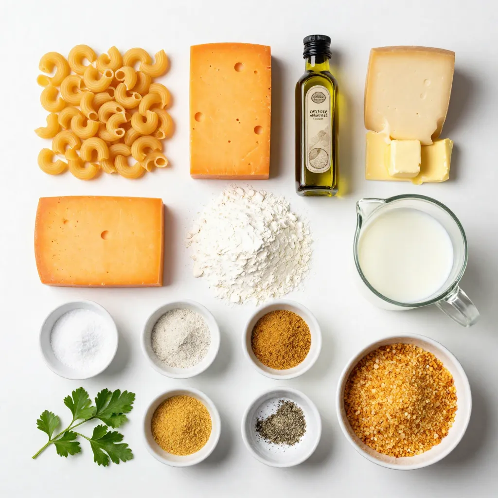 First, the elbow macaroni serves as the base. It’s small and holds the cheese well. Next, we have sharp cheddar cheese. This cheese adds a strong flavor that is key to the dish. Gruyère cheese brings a nutty and creamy touch that complements the cheddar.