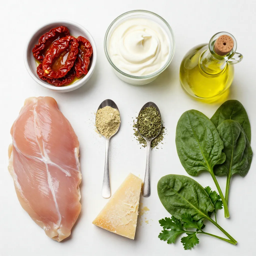 The main ingredients create a tasty base for the dish. Boneless, skinless chicken breasts cook quickly and stay juicy. Sun-dried tomatoes add a rich flavor. Heavy cream brings a smooth and creamy texture to the sauce.