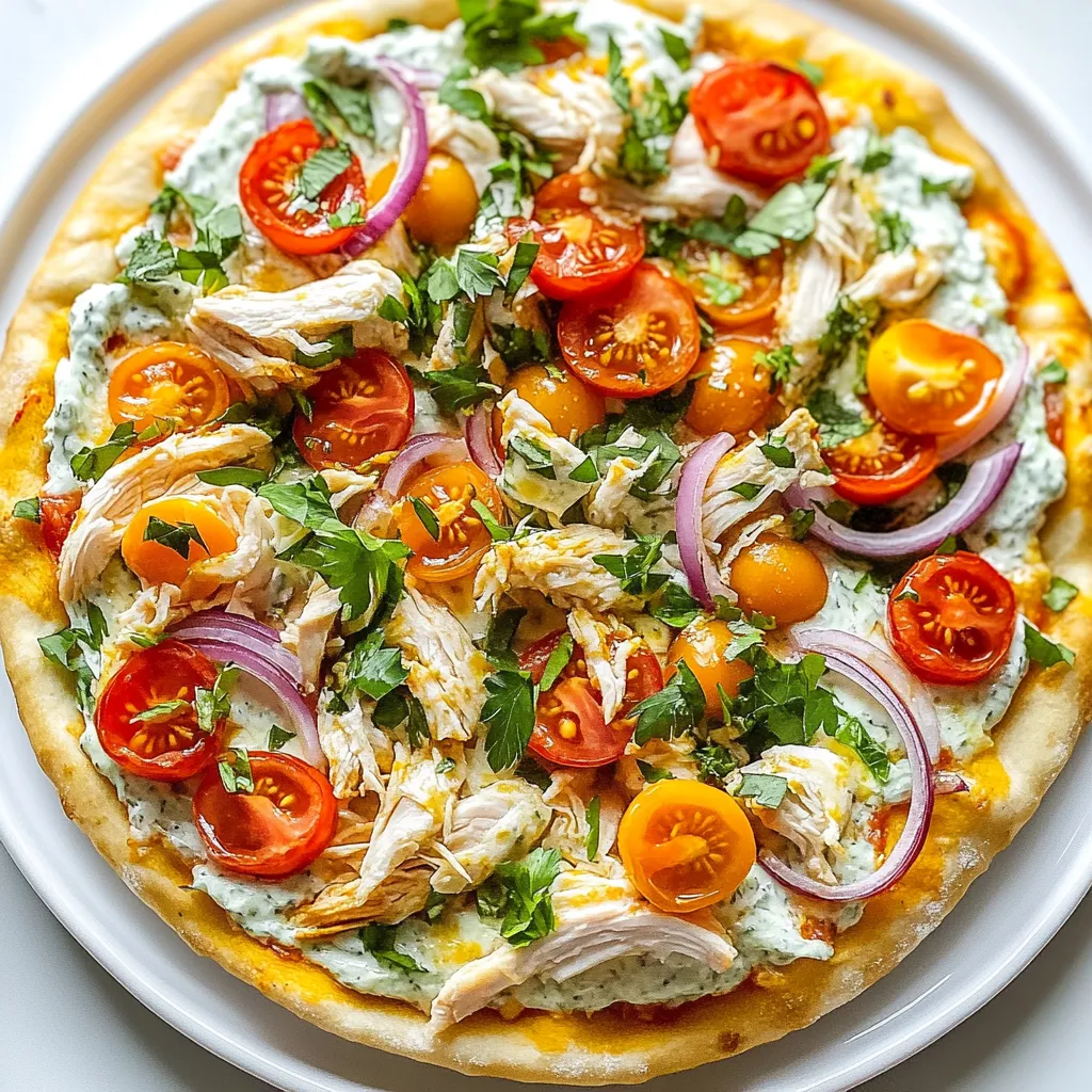 A delicious pizza topped with tzatziki sauce, shredded chicken, and fresh vegetables.