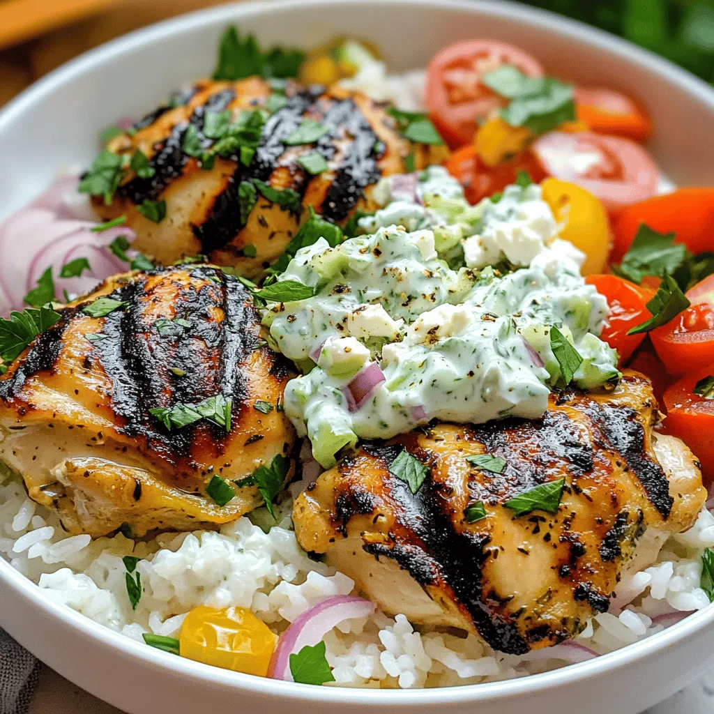 To make Tzatziki Chicken Rice Bowls, you need fresh and tasty ingredients. Here’s what you’ll need: - 1 pound boneless, skinless chicken thighs - 1 tablespoon olive oil - 1 cup jasmine rice - 2 cups water or chicken broth - 1 cup cucumber, grated and drained - 1 cup plain Greek yogurt - 2 tablespoons fresh dill, chopped (or 1 tablespoon dried dill) - 1 tablespoon lemon juice - 1 medium tomato, diced - ½ red onion, thinly sliced - ½ cup feta cheese, crumbled - Fresh parsley for garnish These ingredients create a meal that is both healthy and full of flavor. The right spices make all the difference in taste. For this dish, use: - 2 teaspoons garlic powder - 1 teaspoon dried oregano - Salt and pepper to taste These spices add warmth and depth to the chicken, making it very tasty. Garnishes can add fun and flavor. Here are some you might like: - Extra fresh dill - Slices of lemon - More feta cheese These garnishes make your bowls look great and taste even better! Start by mixing olive oil, garlic powder, oregano, salt, and pepper in a bowl. This blend gives the chicken a nice flavor. Coat the chicken thighs in this mix. Let them marinate for at least 30 minutes. If you want more flavor, marinate overnight in the fridge. Rinse the jasmine rice under cold water until the water runs clear. This step helps remove excess starch. In a medium saucepan, combine the rice and 2 cups of water or chicken broth. Bring it to a boil. Once boiling, reduce the heat to low and cover the pot. Let it simmer for 15 minutes or until the liquid is gone. After that, remove it from heat and let it sit covered for 5 minutes. Finally, fluff the rice with a fork. In another bowl, mix 1 cup of grated cucumber, 1 cup of Greek yogurt, fresh dill, and lemon juice. Stir until everything blends well. Add salt to taste. This sauce is cool and refreshing. Set it aside while you cook the chicken. Heat a grill pan or skillet over medium-high heat. Add the marinated chicken to the pan. Cook for about 6-7 minutes on each side. The chicken should be fully cooked and the juices should run clear. After cooking, let the chicken rest for a few minutes before slicing it. Take four serving bowls and divide the rice among them. On top of the rice, add the sliced chicken. Then add diced tomatoes, red onion, and a generous dollop of tzatziki sauce. For a tasty finish, sprinkle crumbled feta cheese on top. To make it look nice, add a sprinkle of fresh parsley on top. This adds color and flavor. Serve the bowls immediately for a fresh meal. Enjoy every bite of your Tzatziki Chicken Rice Bowls! To get the best flavor from your chicken, marinate it well. Use olive oil, garlic powder, and oregano. Make sure to coat all sides of the chicken. Let it sit in the fridge for at least 30 minutes. For even better taste, marinate overnight. This allows the flavors to soak in deeply. To cook jasmine rice, first rinse it under cold water. This helps to remove excess starch. Use a ratio of 1 cup of rice to 2 cups of water or chicken broth. Bring the mixture to a boil, then reduce the heat. Cover the pot and let it simmer for 15 minutes. After cooking, let it sit covered for 5 more minutes. Fluff it with a fork before serving. You can change up the tzatziki sauce to suit your taste. For a spicier kick, add a bit of cayenne pepper. If you prefer a creamier texture, mix in extra Greek yogurt. You can also use fresh mint instead of dill. This gives a different flavor while keeping it fresh and bright. {{image_2}} You can swap chicken for beef or tofu. For beef, choose ground beef or steak. Marinate it just like the chicken. If you prefer tofu, use firm or extra-firm tofu. Press it to remove excess water, then marinate and cook. Both options add a tasty twist to the dish. While jasmine rice is great, try quinoa or brown rice. Quinoa is protein-rich and cooks quickly. Brown rice is heartier and offers more fiber. Both grains work well with the tzatziki sauce and chicken. Just adjust the cooking time as needed. These grains bring new flavors and textures. You can enhance your bowls with fresh veggies. Add bell peppers, spinach, or roasted zucchini for color and crunch. You could also toss in olives for a salty bite. For a fun twist, top with avocado or roasted chickpeas. These extras not only boost flavor but also add nutrition. Feel free to mix and match based on your taste! After you enjoy your Tzatziki Chicken Rice Bowls, store leftovers right away. Place the chicken, rice, and tzatziki in separate containers. This keeps everything fresh. Make sure to use airtight containers to prevent moisture loss. Leftovers stay good for up to three days in the fridge. When you're ready to eat, reheating is easy. For the rice, use a microwave-safe bowl. Add a splash of water to keep it moist. Cover the bowl with a damp paper towel and heat for about one minute. For the chicken, heat it in a skillet over medium heat until warm. This keeps the chicken juicy. Tzatziki can be served cold, so no need to heat that. If you want to save the Tzatziki Chicken Rice Bowls for later, freezing is a good choice. Freeze the chicken and rice together in a freezer-safe bag or container. Make sure to remove as much air as possible. Tzatziki does not freeze well, so keep it fresh in the fridge. You can freeze the meal for up to two months. Just thaw overnight in the fridge before reheating. Yes, you can use chicken breasts. They are leaner than thighs. This change will make the dish a bit drier. Keep an eye on the cooking time. Cook the breasts for about 5-6 minutes per side. Always ensure they are cooked through. If you want a substitute for Greek yogurt, try sour cream. You can also use plain yogurt. For a dairy-free option, use coconut yogurt. Each option adds a different flavor. Choose what fits your taste best. You can store the bowls for up to three days. Keep the chicken and tzatziki separate for best results. Use airtight containers to preserve freshness. Reheat the chicken gently