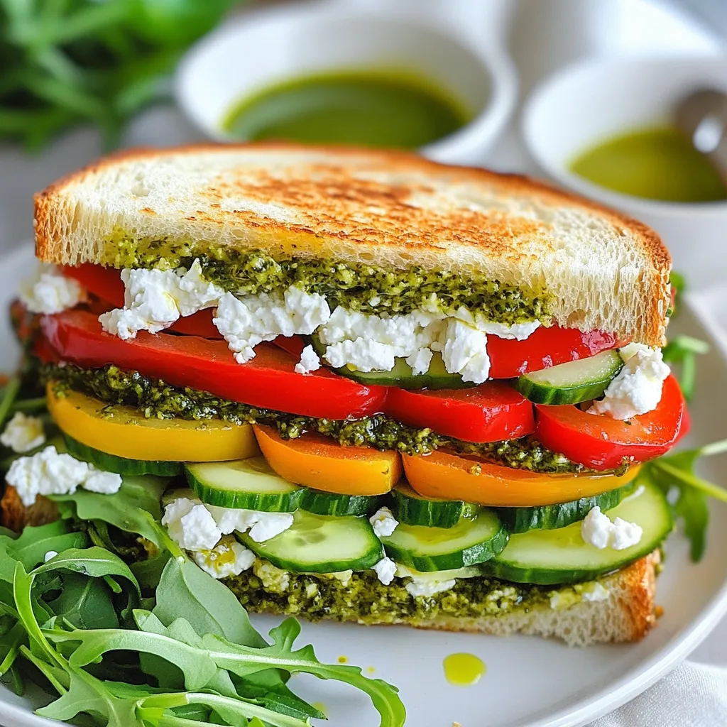 Grab your sourdough bread. Take a slice and spread cream cheese on one side. Use a good amount to cover it well. Now, take the second slice and do the same. On the cream cheese side of one slice, spread the pesto. Next, layer the roasted red peppers. Make sure to spread them evenly. Add the arugula and sliced cucumbers on top. Then, sprinkle feta cheese over everything. Don’t forget to add salt and pepper to taste. Finally, place the other slice of bread on top, cream cheese side down.