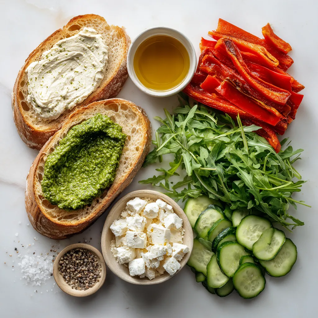 When you pick your ingredients, look for bright colors and good smells. For sourdough, find bread with a crust that is firm but not hard. Make sure the cream cheese feels soft and smooth. Choose pesto that has a fresh, herbal scent. For vegetables, select arugula that is crisp and green. The cucumbers should be firm and free of soft spots. Roasted red peppers should be vibrant and juicy. Lastly, pick feta cheese that is moist and crumbly for the best flavor.